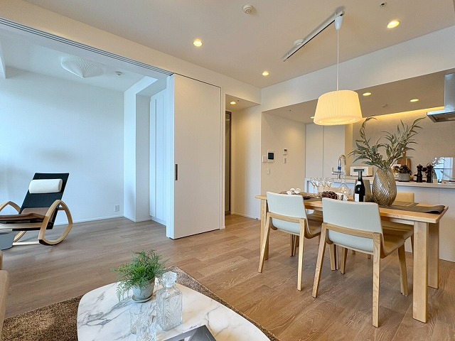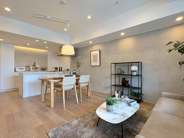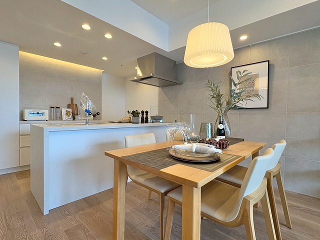 木目のぬくもりとホワイトを基調にしたリビングダイニングキッチンは、入った瞬間から心がほっと落ち着く空間。約15.4帖のゆとりある広さは、ご家族でのお食事や団らんはもちろん、休日の読書や趣味の時間まで、思い思いにお過ごしいただけます✦