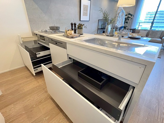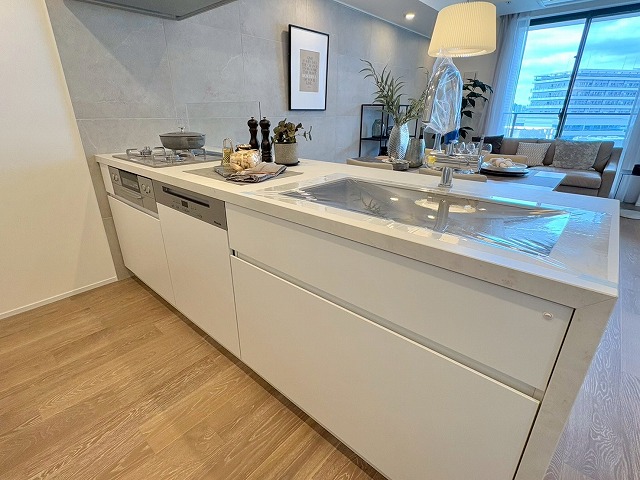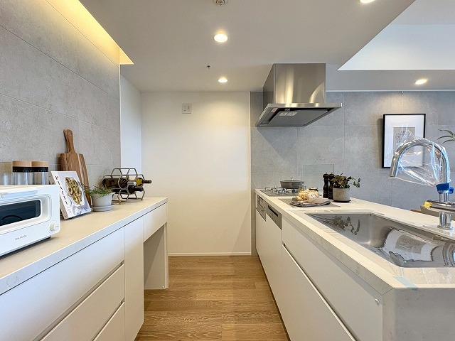 真っ白な対面キッチンは料理中も自然にコミュニケーションが生まれる設計。朝は家族でのんびり朝食を楽しみ、夜は友人を招いてホームパーティを♡キッチンのそばにダイニングテーブルを置けば料理の配膳や片付けもスムーズで、家事の負担が軽くなるのも嬉しいポイント!