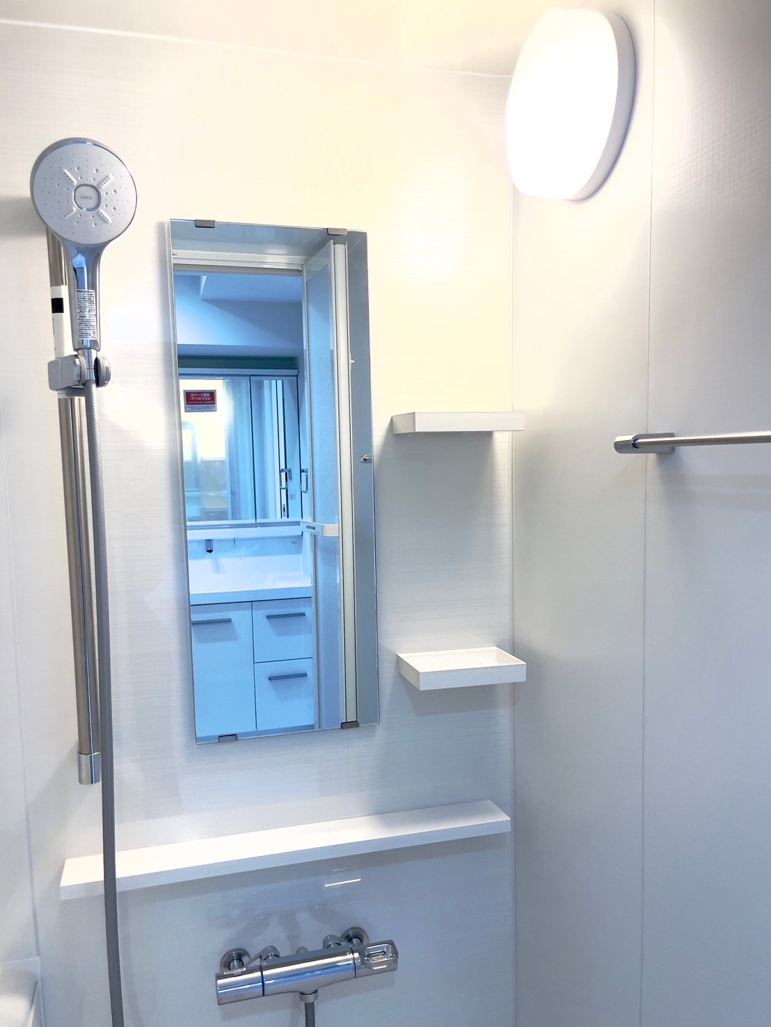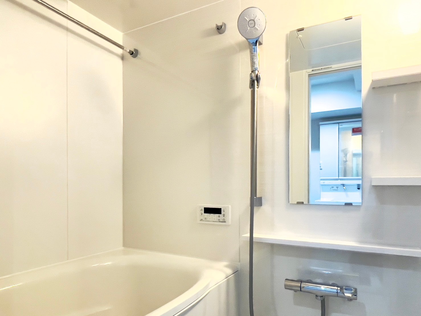 雨の日や花粉の季節も心配無用。浴室乾燥機があれば、洗濯物を気にせず室内でサッと乾かせます。カウンターや収納ラックも備わっているので、バスルーム内をいつもすっきりと整理整頓できるのも嬉しいポイント。縦長の鏡は全身を映せる仕様で、身支度やスタイルチェックもスムーズに。