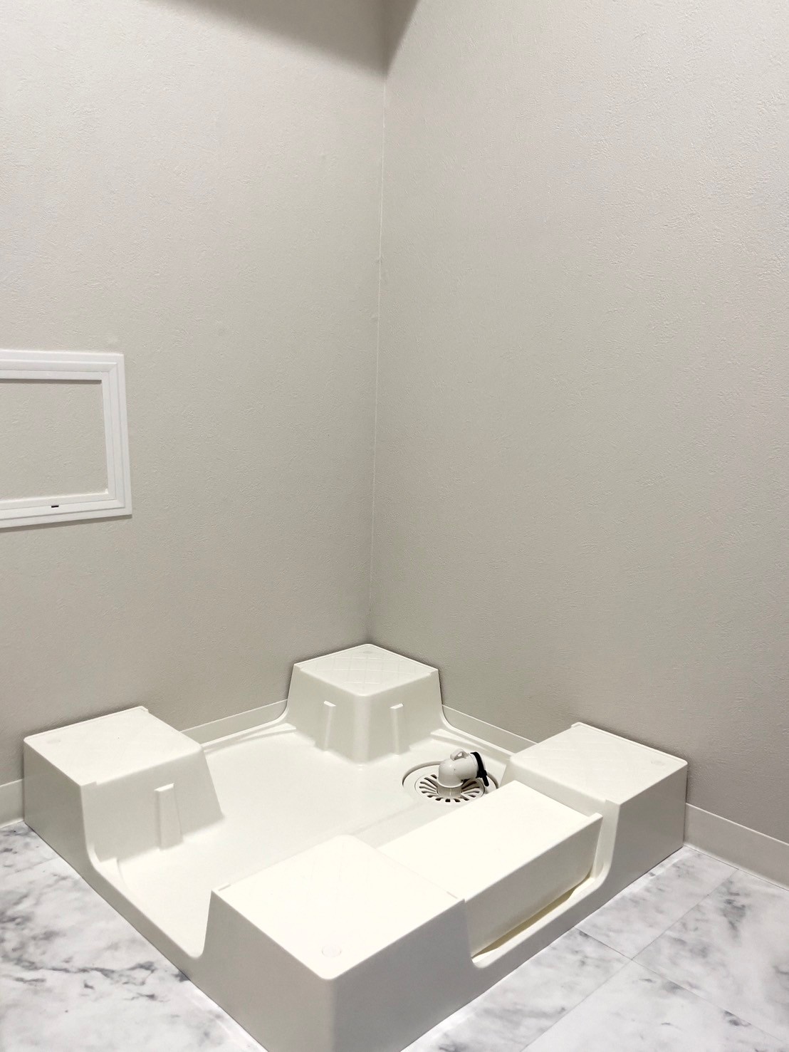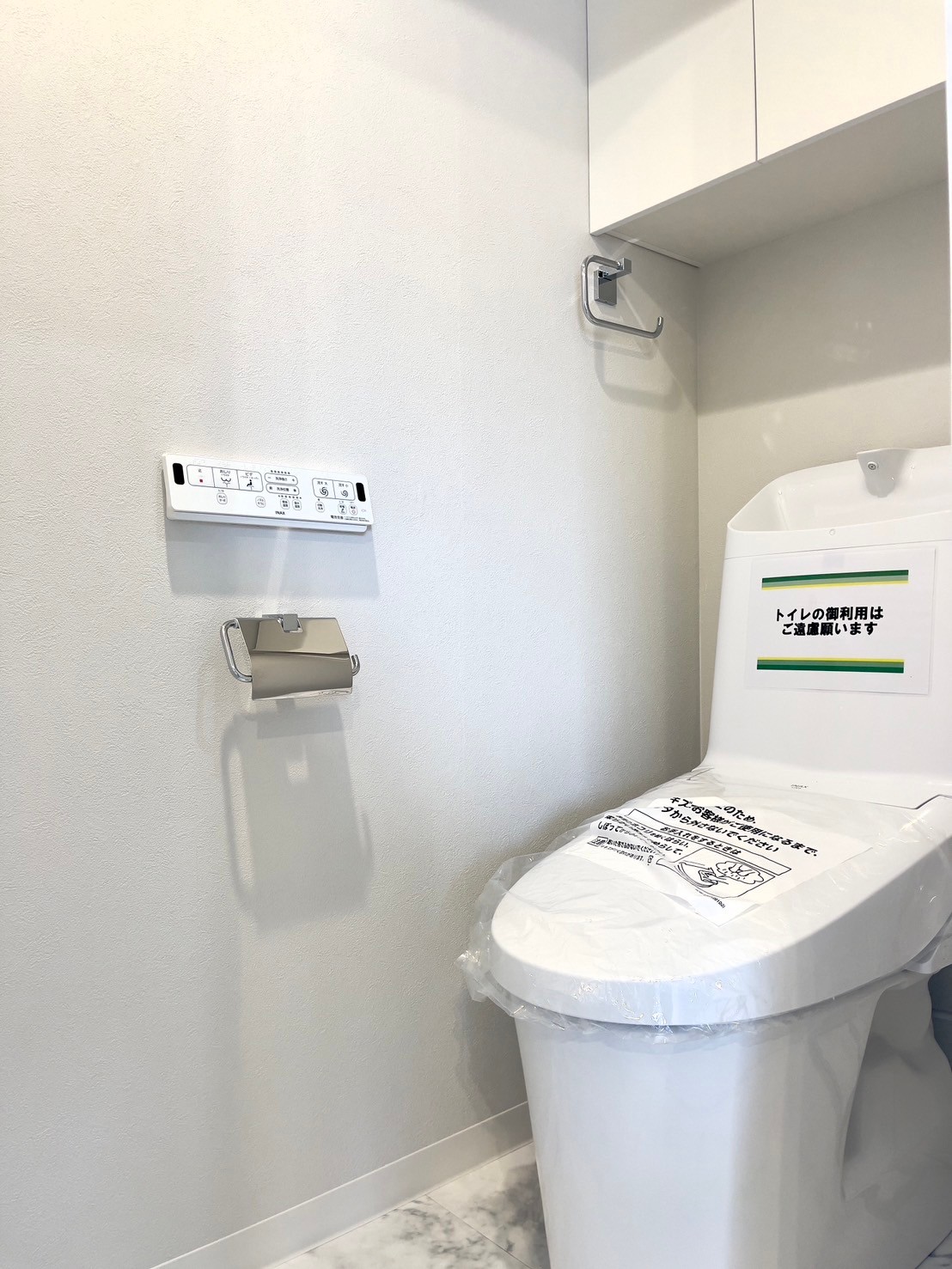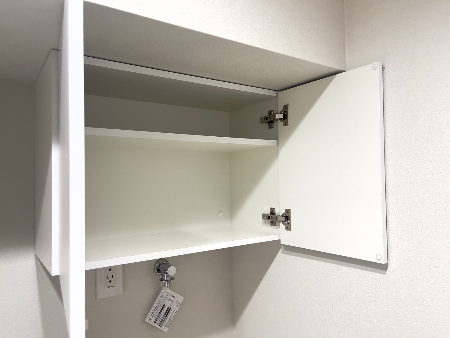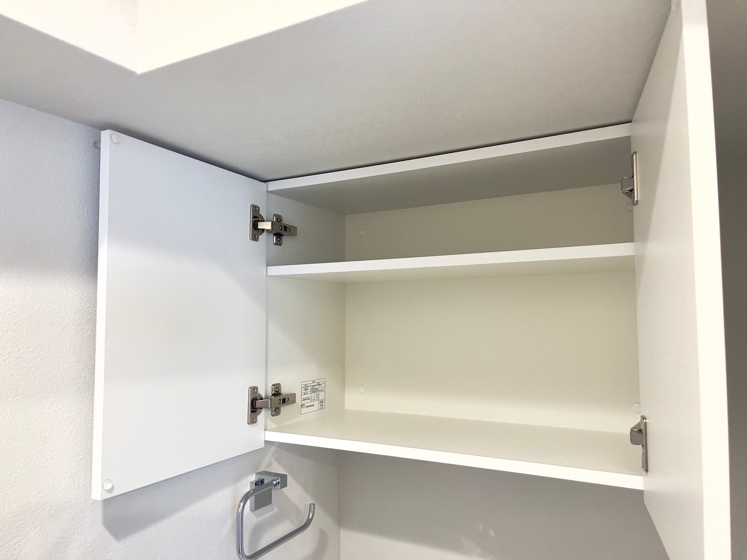 タンク一体型のトイレにはウォシュレットを完備し、使い心地は快適そのもの。上部のキャビネットにトイレ用品をまとめて収納できるため、空間がすっきり整い、清潔感もアップ。さらにタンク付きなので、停電や災害時でも安心して使える頼れる設計✧