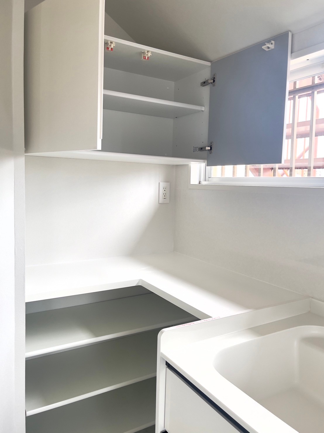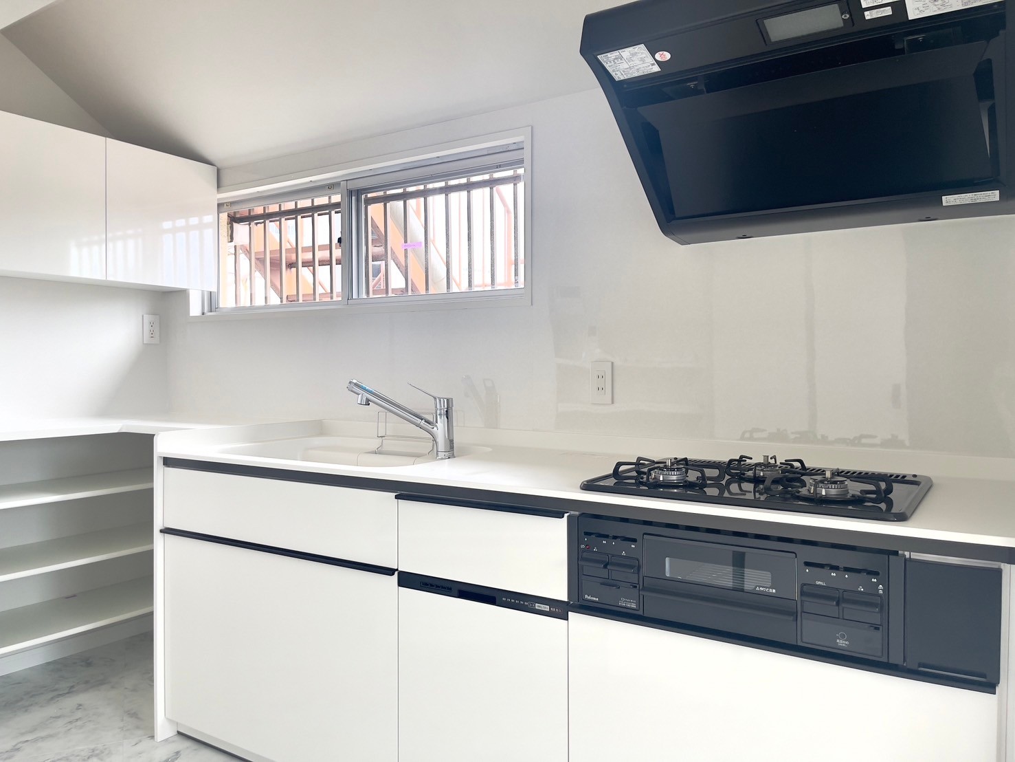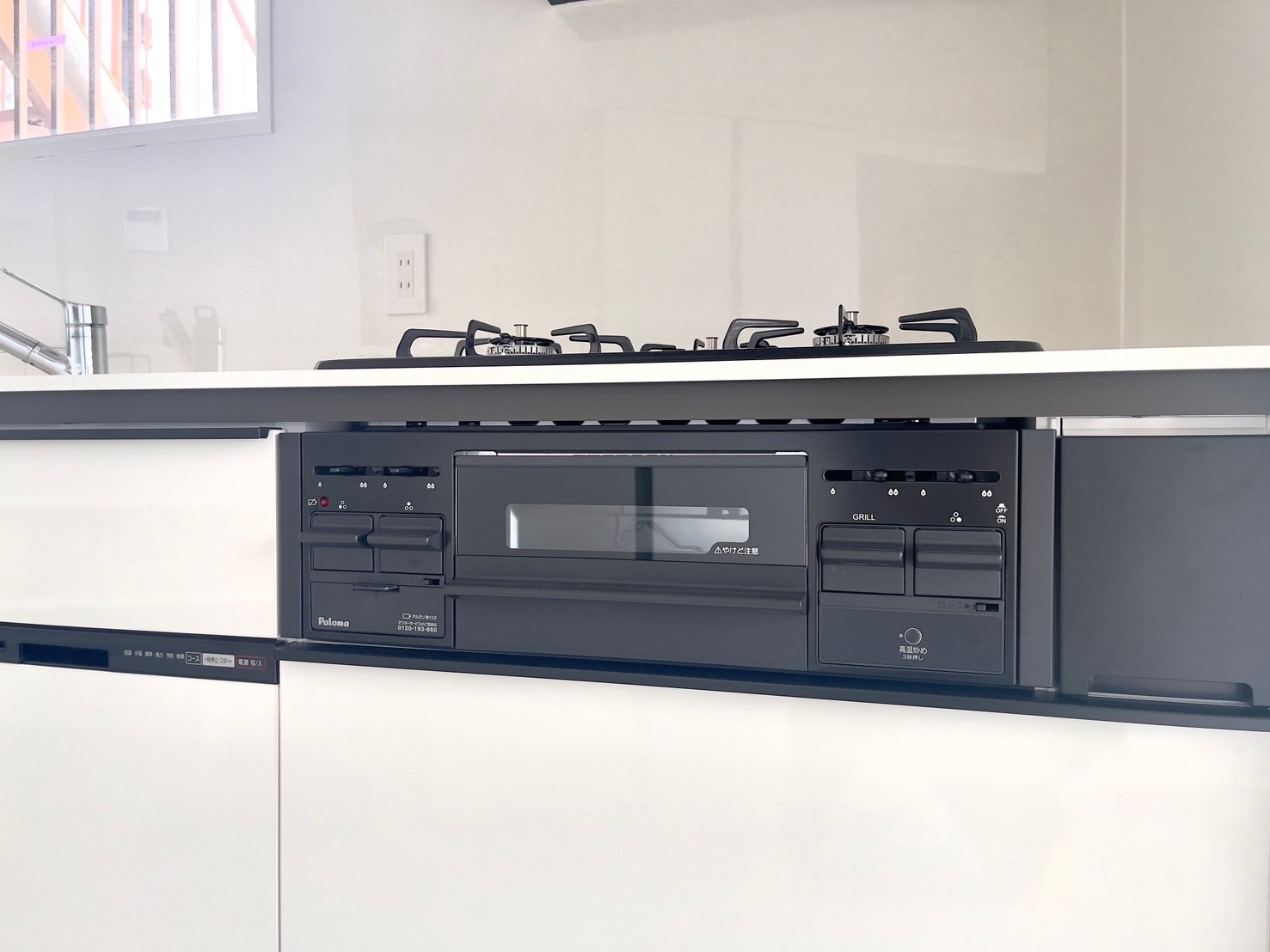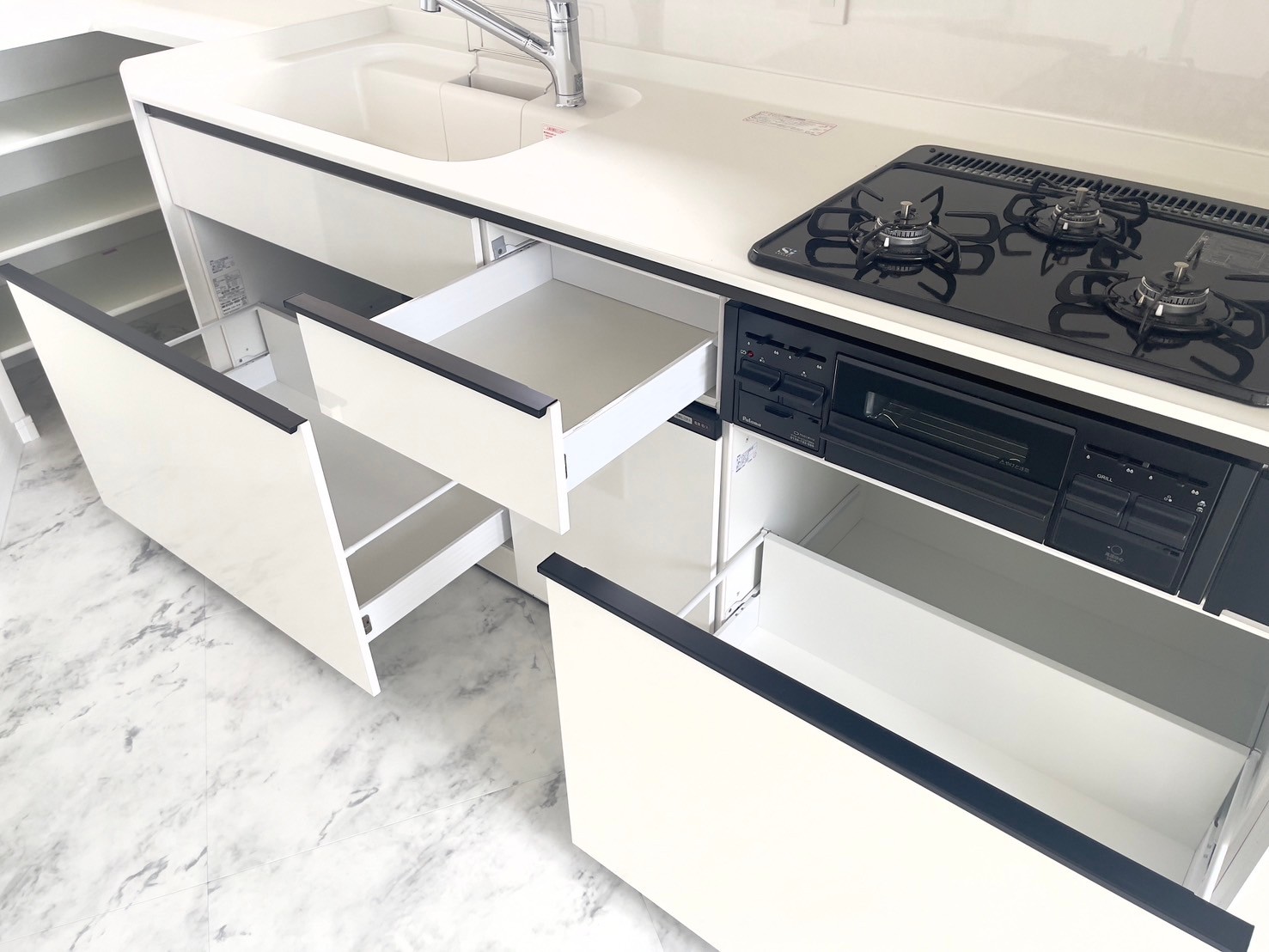 白を基調に仕上げられたキッチンは、清潔感と統一感に溢れ、空間全体をスッキリと見せてくれます。シンプルながらもスタイリッシュなデザインで、毎日の料理や家事が自然と楽しくなる雰囲気。食洗機を完備しているため、家事の手間もぐっと軽減されますよ◎