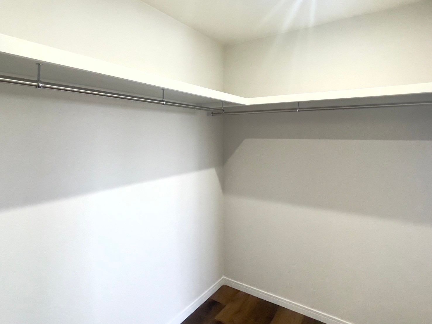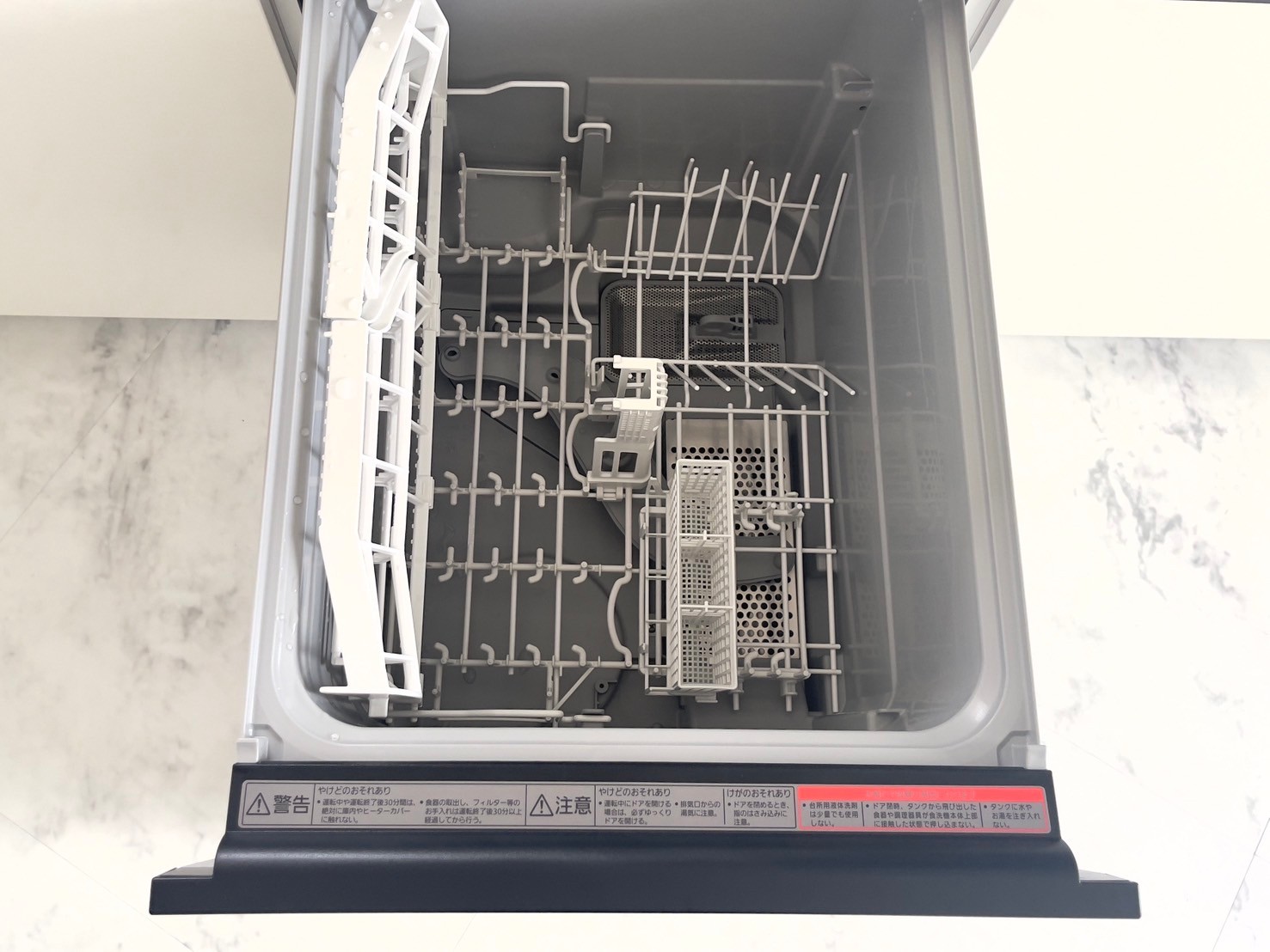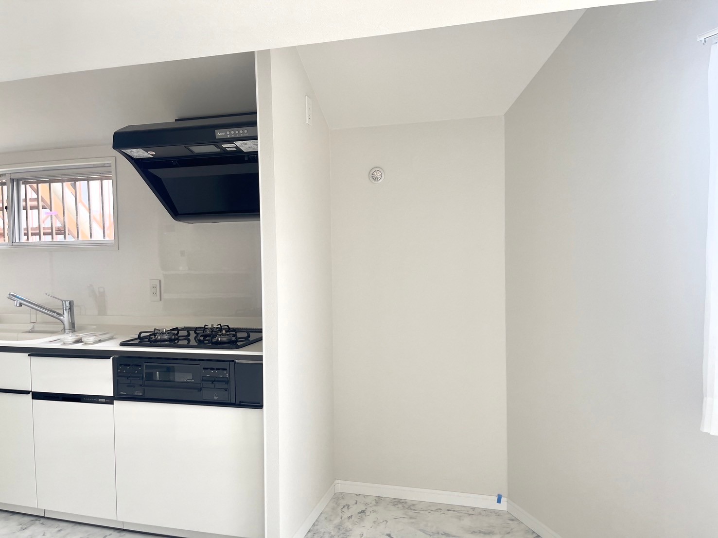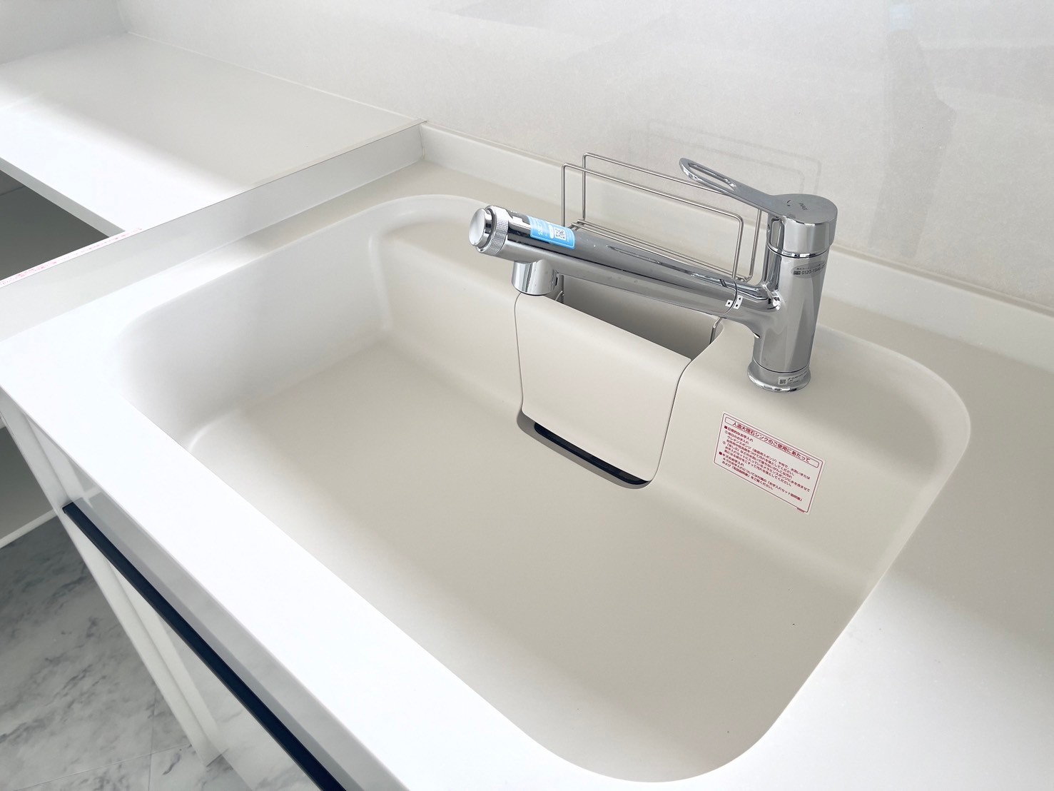 白を基調に仕上げられたキッチンは、清潔感と統一感に溢れ、空間全体をスッキリと見せてくれます。シンプルながらもスタイリッシュなデザインで、毎日の料理や家事が自然と楽しくなる雰囲気。食洗機を完備しているため、家事の手間もぐっと軽減されますよ◎