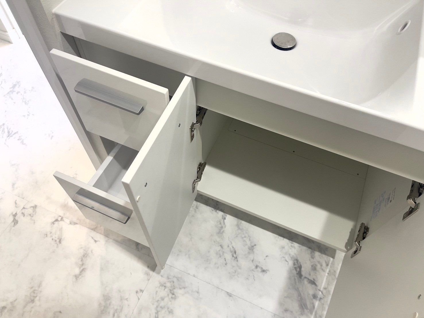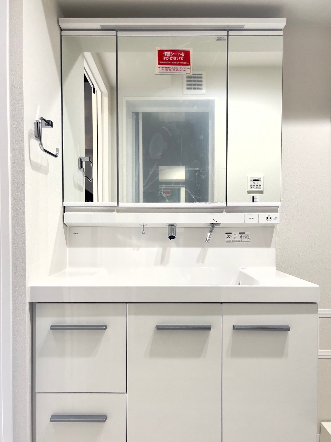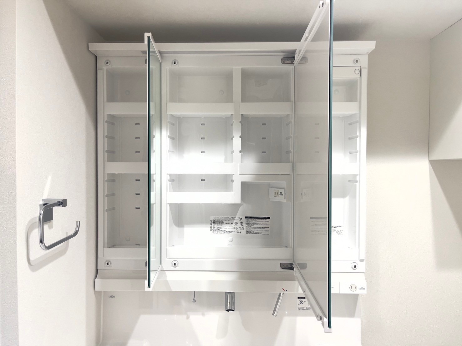 ミラーキャビネットの内側は細かく仕切られており、歯ブラシや化粧品などの小物もきれいに収まります。下部収納も4つに分かれているため、タオルや日用品を用途ごとに分けてしまえて取り出しもスムーズ。毎日の身支度が快適に行えそうですね♩