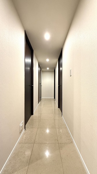 上品な光沢が美しい大理石調フロアが印象的な廊下。柔らかなトーンの壁面と調和し、ホテルのような高級感を演出✧L字型のレイアウトが全室への動線をスムーズに導きます。