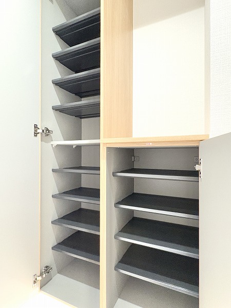 シンプルモダンですっきりとしたデザインの玄関。シューズクローゼット付きなので、玄関周りに靴が散らばることなく整頓された状態を保つことができそうです。姿見が備わっているため、お出かけ前の身だしなみチェックは完璧✦