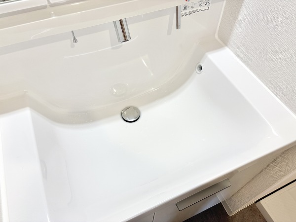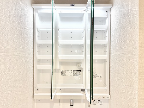 パウダールームには水回りの設備がひとまとめに配置されており、身支度や掃除をスムーズに行える動線の良さが魅力的です✿独立洗面化粧台は3面鏡のミラーキャビネット式。鏡裏は細かく仕切られていて、化粧品や歯ブラシなどを綺麗に整理整頓できます。