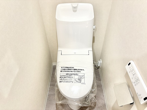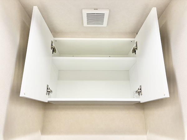 ホワイトを基調とした独立タイプのトイレは、シンプルでありながらも清潔感あふれる空間。手洗い一体型で節水に取り組めるのが嬉しいですよね。上部にはトイレ用品をまとめて収納できる棚が備わっているため、空間をすっきりと整えることができます。