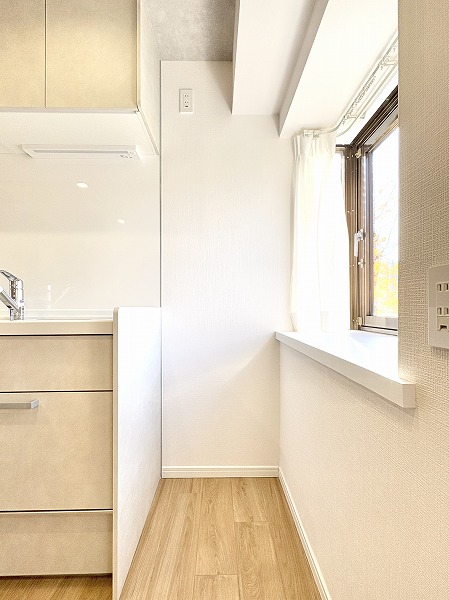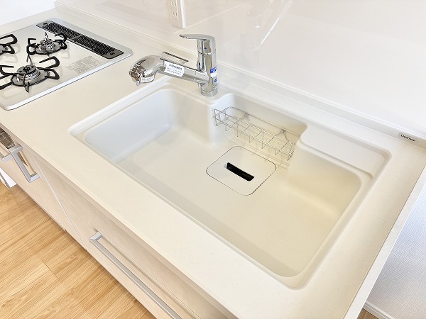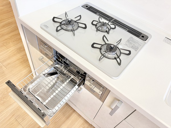 壁付け型のキッチンは集中して作業に取り組むことができ、手入れのしやすさが嬉しいポイント。3口コンロにグリル、浄水器が付いていて、機能面が充実しています。上下に収納が設けられているため、かさばるキッチン用品をすっきりと収納可能です。