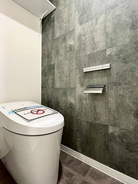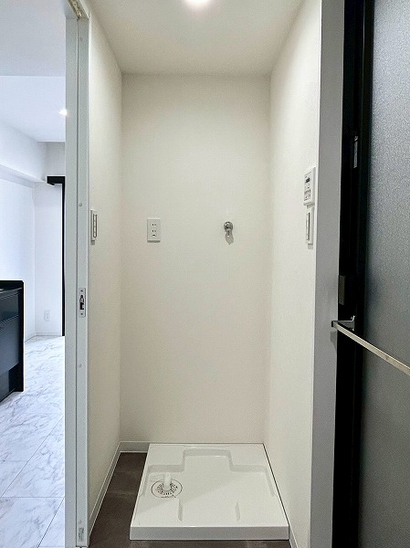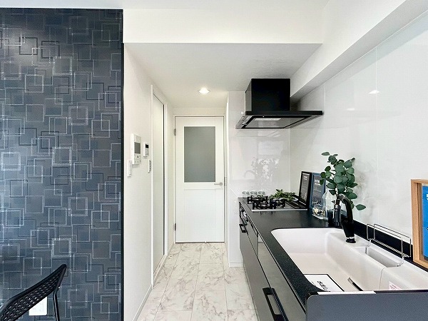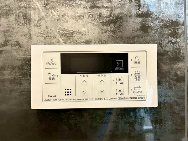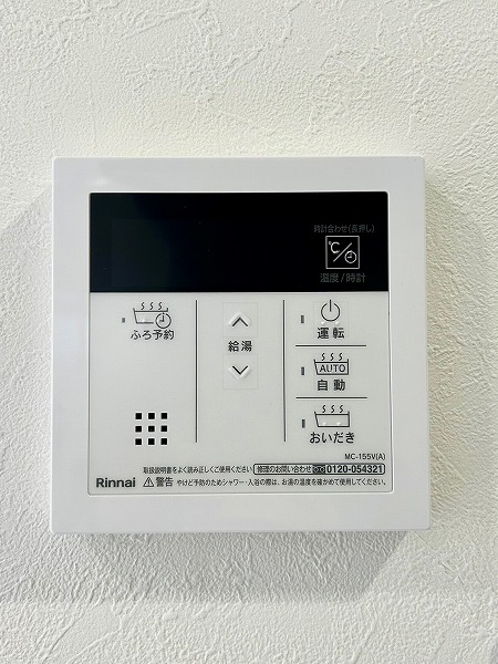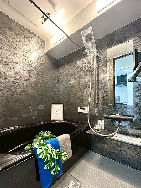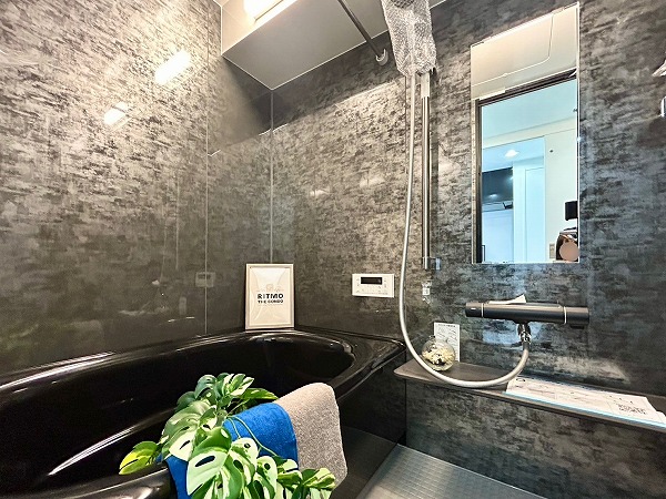 ブラックの浴槽とダークマーブル柄の壁は高級感があり、ホテルライクな印象を与えていますね♪また、快適なご入浴に欠かせない追い焚き機能と、天候に左右されずいつでも洗濯物を干せる浴室乾燥機を完備しています♪