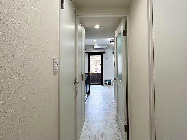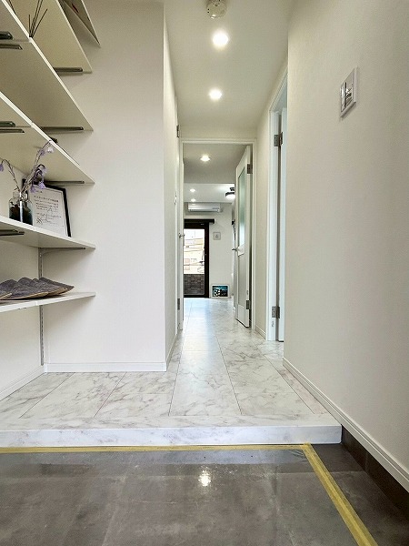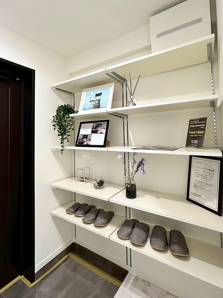 玄関にはオープンシェルフ型シューズラックがあります。靴をたくさん置けるのはもちろん、棚の位置を変えてインテリア小物やお気に入りの写真などを飾れば玄関をお洒落にできますね✧