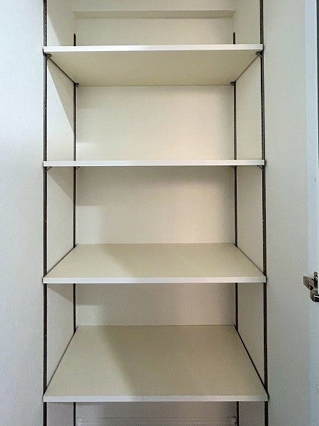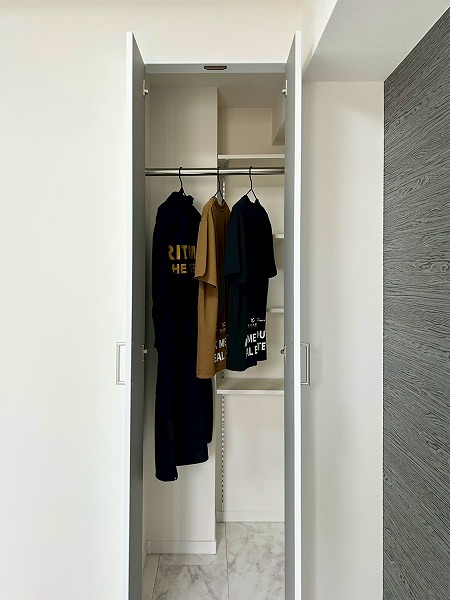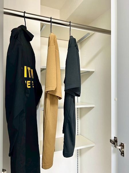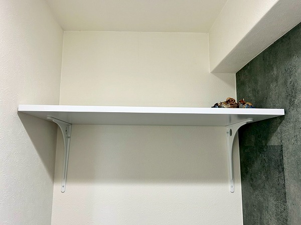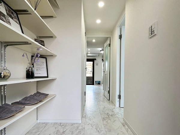 サニタリールームの手前に高さのある収納棚が設置されています!高さを自由に変えられる仕様となっており無駄なく収納ができそうですね✧タオルなどをストックして置けば、朝の身支度や帰宅後の手洗いの際に便利ですね✧