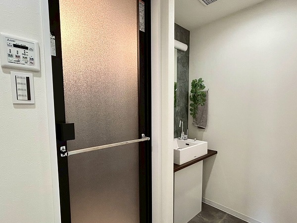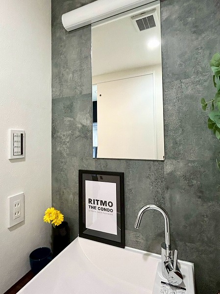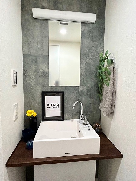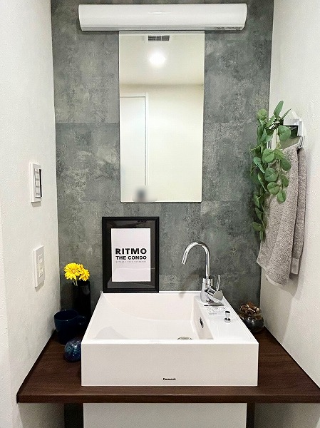 サニタリールームには化粧洗面台・洗濯機置き場・バスルームが集結。シンプルな造りでありながらグレーのアクセントクロスが魅力的な洗面所は、使いやすさとオシャレさを兼ね備えています。下には収納棚があり、日用品等をしまうことができますよ。