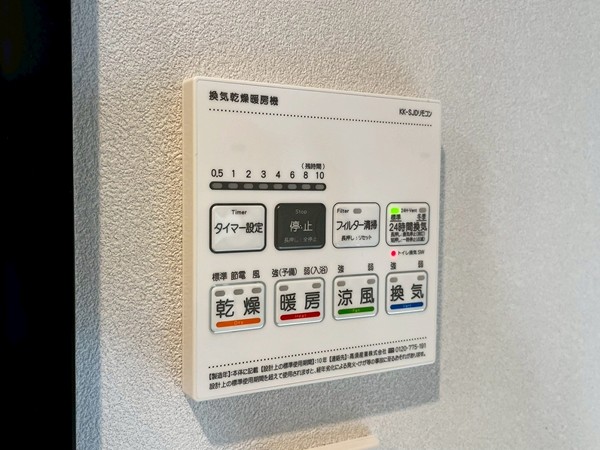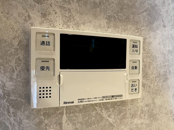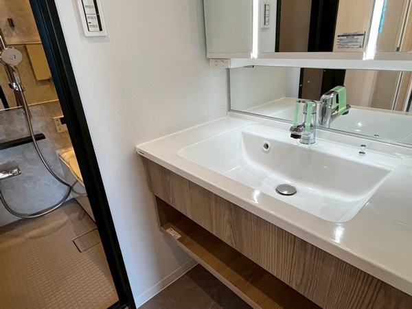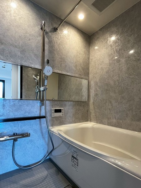 バスルームは、高級感を感じる大理石調のグレーの壁。ダウンライトが素敵なリラックスタイムを演出してくれます。浴室乾燥付きなので、雨の日でも洗濯物の心配はいりません。暖房&涼風機能を活用すれば、1年を通して快適なお風呂タイムが叶いそう。