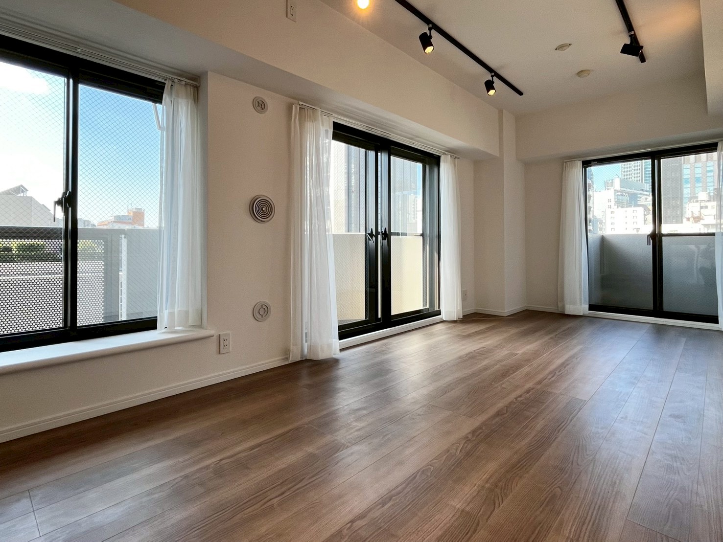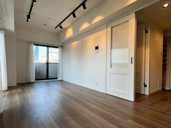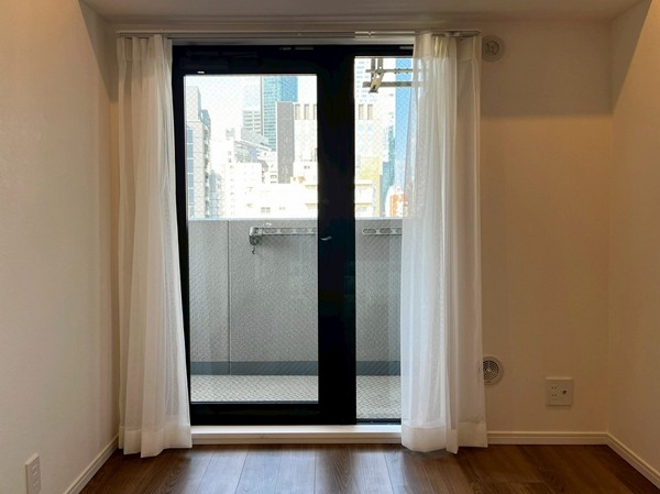 ブラックの縁取りが印象的な窓は、広さがいっぱいに確保された贅沢な造り。メインルームからは2つのバルコニーへ出ることができ、その先には渋谷の街並みが広がります。どんな家具とも馴染むホワイトの壁とウッドの床は、どんなお部屋にしようか、想像力をかき立てますね。