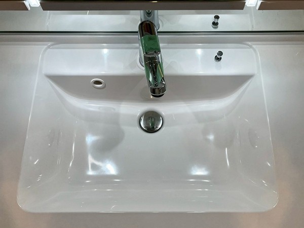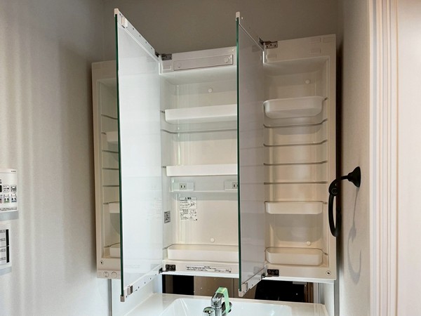 三面鏡付きの洗面カウンターは、身支度を整えるリラックススペースにふさわしい、柔らかな木の風合いに安心感を感じられます。シンク下の棚のほか、鏡の裏には洗面周りのグッズを収納できるスペースがあります。シンプルで実用性も抜群です。