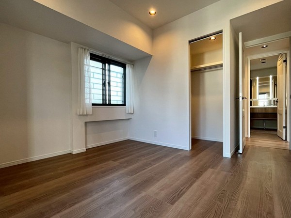 ベッドルームは約5.0帖。優しいダウンライトの光が1日の終わりを見守ってくれます。お部屋に付いているバルコニーをたどると、メインルーム北西側の窓へと繋がっているんです。ひとつのお家にバルコニーが2つついているなんて、贅沢ですよね。