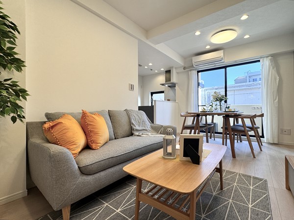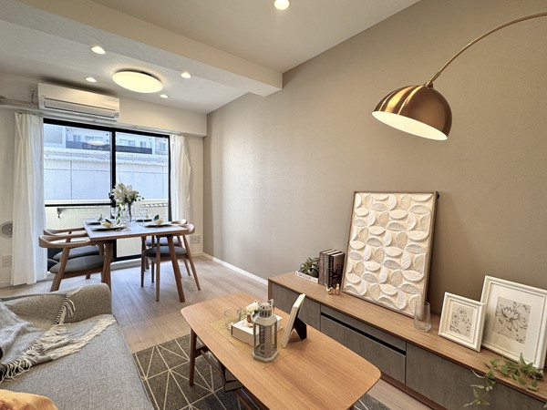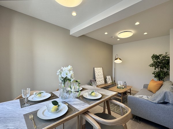 約14.5帖のメインルームは、空間にゆとりがありながらも落ち着きのある居心地。リビングと食事スペースを無理なく分けられるため、生活動線もスムーズです。室内は上質感のあるリノベーションが施され、優しい自然光が静かに差し込む空間に仕上がっています。