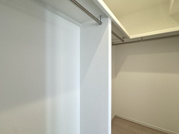 大容量のウォークインクローゼットを備え、収納面は安心。衣類だけでなく、スーツケースや季節家電など嵩張りがちな荷物もすっきり収まります。枕棚には使用頻度の少ない物を置くのがおすすめです。住空間を美しく保てるのは嬉しいポイント◎