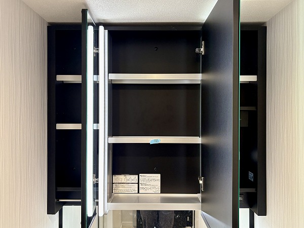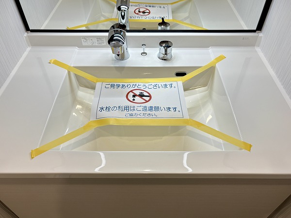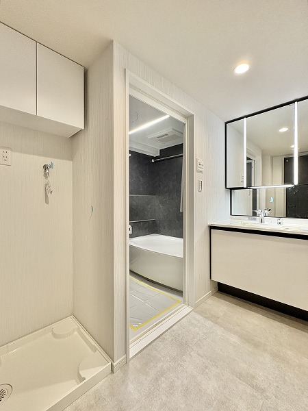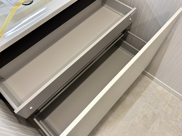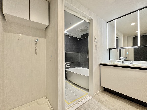 白を基調としたパウダールームは、清潔感と上質さが感じられる空間。ゆったりとした独立洗面化粧台は鏡の裏や下部に十分な収納スペースがあり、化粧品や小物を整理整頓できます。さらにミラーに備わるライトが顔を明るく照らし、朝の準備やメイクも快適♥