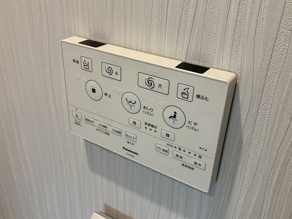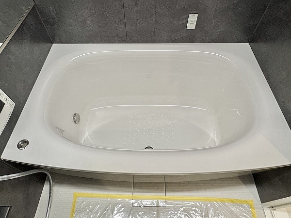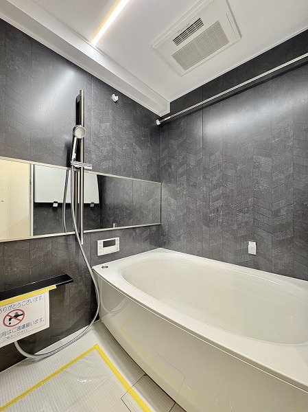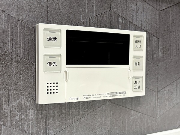 ヘリンボーン柄のパネルが目を惹くバスルーム。追い炊き機能を搭載しているため、いつでもボタンひとつでお湯の温度を調整可能です。好みのタイミングで温かい湯船に浸かり、ゆったりとバスタイムを満喫しましょう♩