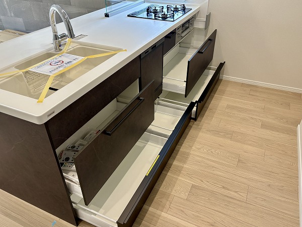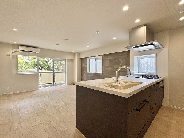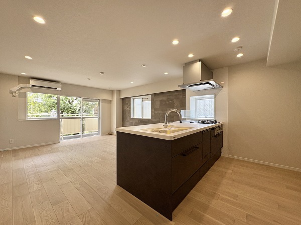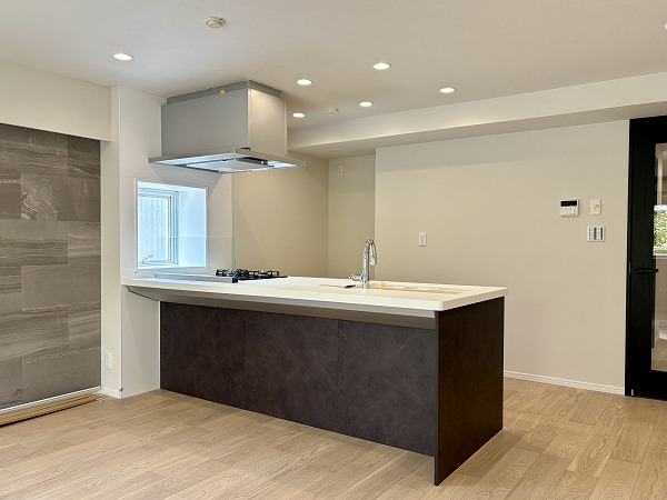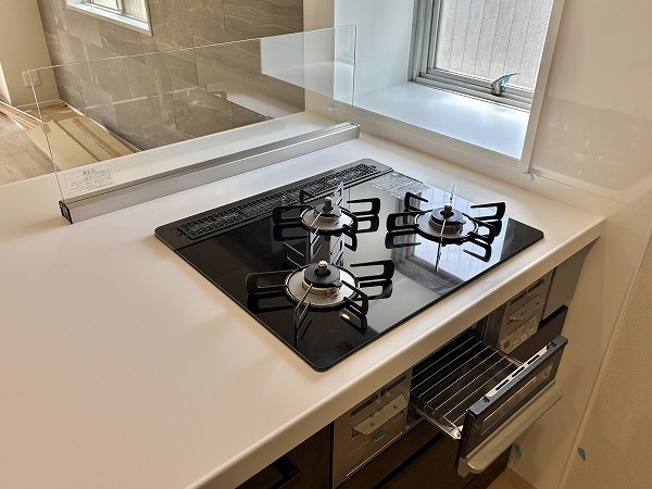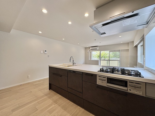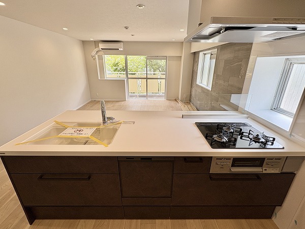 新調されたシステムキッチンは、人気の対面式スタイル。ご家族やゲストと会話を楽しみながら調理ができる空間です。3口コンロにはグリル付きでさらに食洗器も完備。忙しい日々の家事をしっかりサポートしてくれますよ✦
