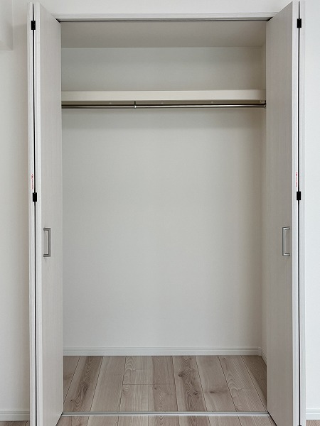 洋室にはウォークインクローゼットが備わっていました。両サイドにハンガーパイプが付いているため、お洋服を種類別に掛けたり、シーズン別に分けてしまっておけます。枕棚は高い位置にあり背の低い方だと取り出しにくいので、使用頻度の低いアイテムを収納するのがオススメですよ♪