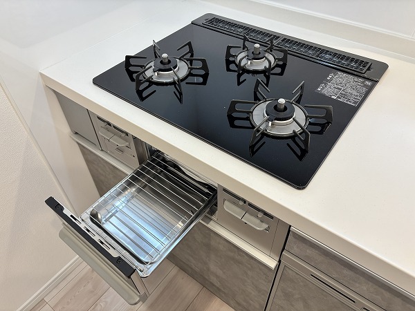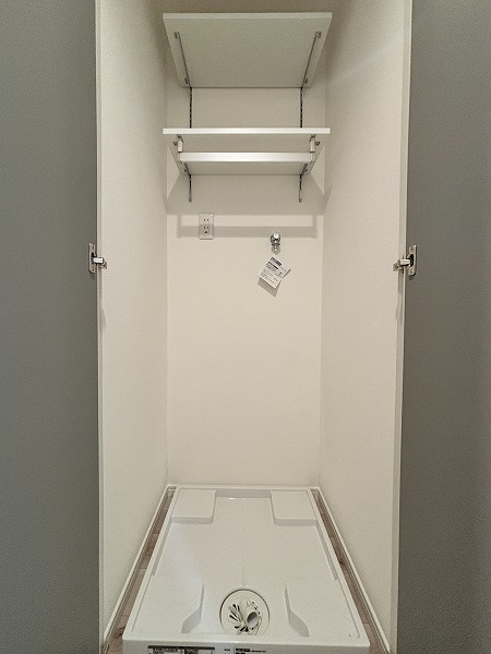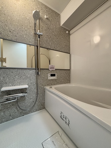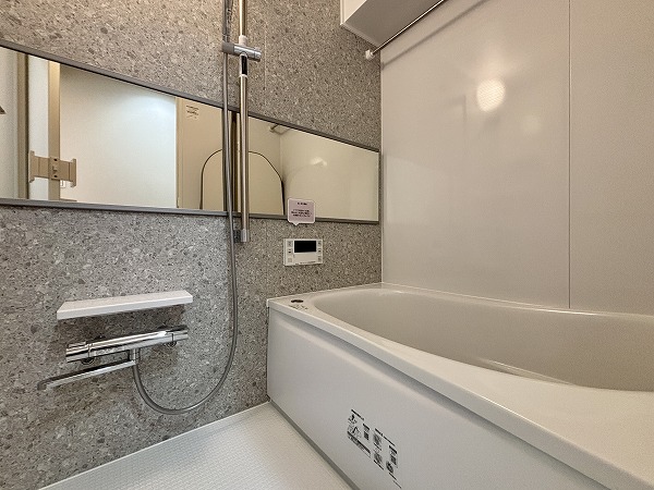 バスルームもキッチンと同じ白×グレーで統一され、空間全体に洗練された一体感を演出。グレーの家具や小物を合わせれば、お部屋全体のコーディネートも楽しめそうです♩バスタブにはハンドレストが備えられ、ゆったりとくつろげる仕様に。