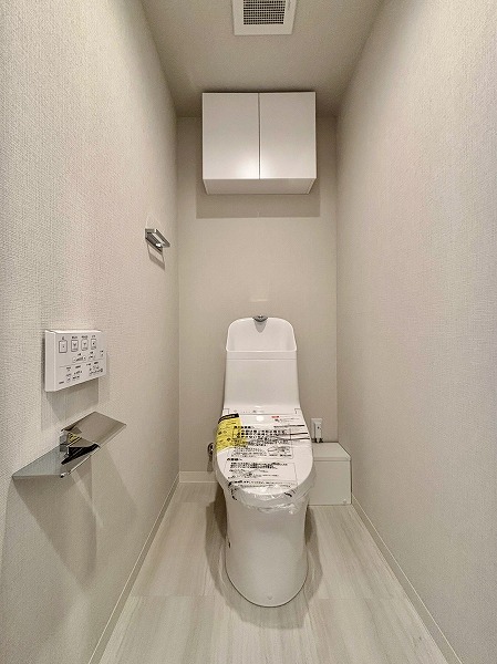 トイレは、玄関から廊下に進み右手に設けられています。くすみグリーンのクロスが施され可愛らしい印象を受けました♥手洗い一体型はなんと節水効果が見込めるんですよ。小さなことから節約ができるのは嬉しいですね。収納はなかったので、別途でボックスなどをご用意ください♪
