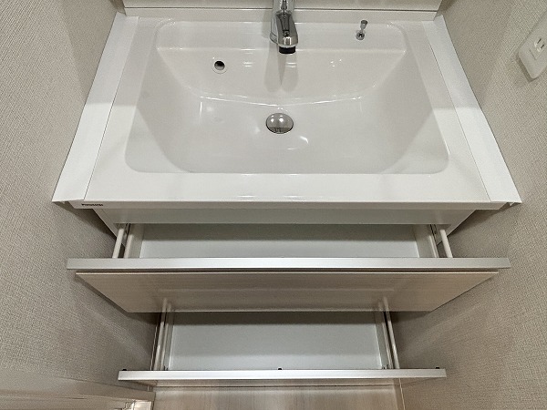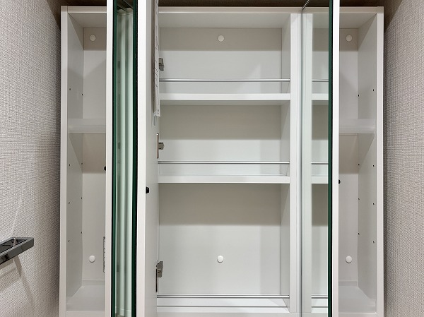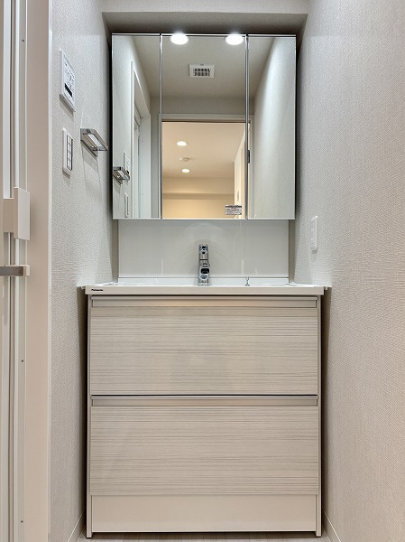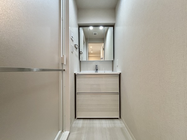 サニタリールームはリビングダイニングキッチンから直接アクセス可能で、洗面化粧台、脱衣スペース、バスルームが一体となった使いやすい設計です。洗濯機置き場は玄関廊下に独立しており、洗濯中以外は扉を閉めて生活感をさりげなく隠せますよ♩