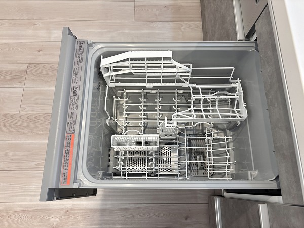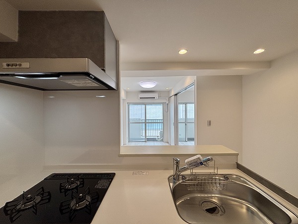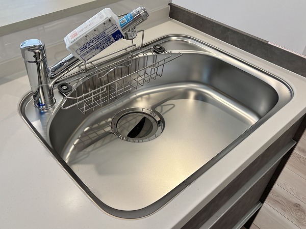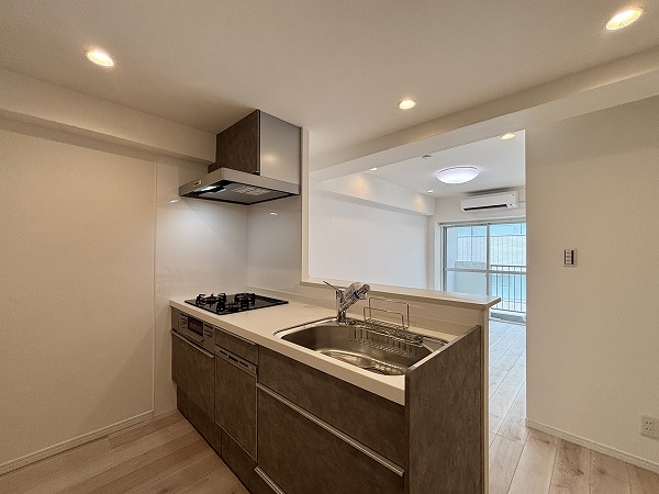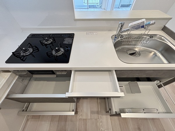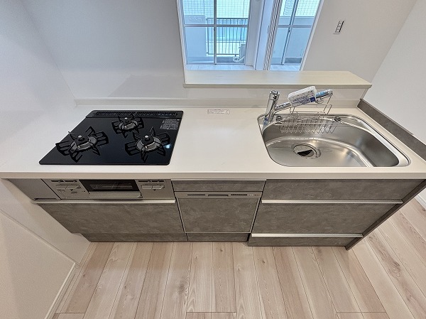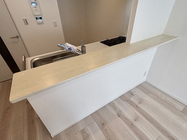 キッチンは対面式を採用◎対面式は油が飛ぶことで室内が汚れてしまうリスクがありますが、こちらはコンロの前面が壁になっているので、汚れる心配はありませんよ✦シンクは浄水器一体型水栓を搭載。幅があり食材の下処理も楽に行えそうでした♡