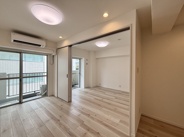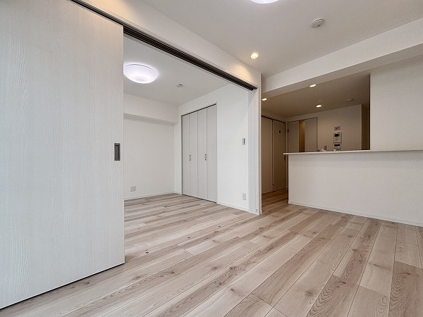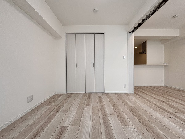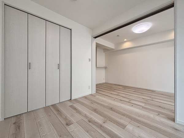 約5.4帖の洋室はメインルームと引き戸でゆるやかに仕切られた空間。引き戸はフルオープンにできるため、開ければリビングがさらに広く感じられ、光や風もたっぷり取り込めます。もちろん戸を取り外してワンルームとして使うことも可能♥クローゼットは幅広で高さも十分にありました。