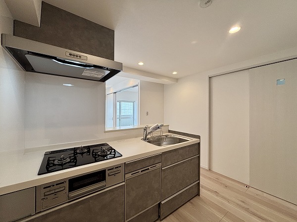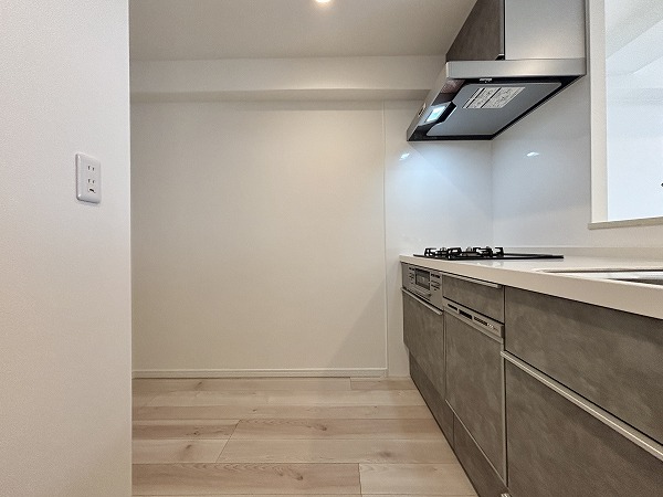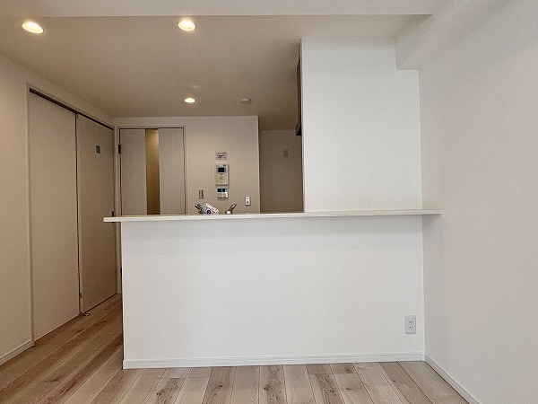 白とグレーで統一されたセミオープンキッチンは、空間のアクセントとしても存在感があります。カウンター越しに料理や片付けがスムーズに行え、家事のストレスも軽減◎面スペースが広く、冷蔵庫だけでなくカップボードも置けるので、キッチン周りをすっきり整えながら、快適に使いこなせますよ✧