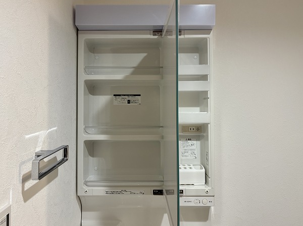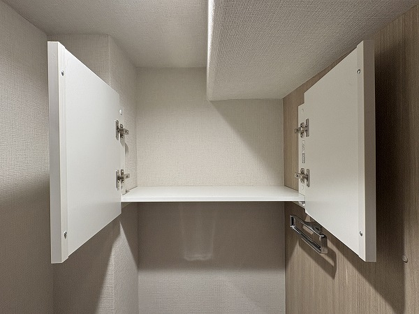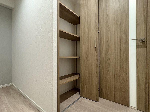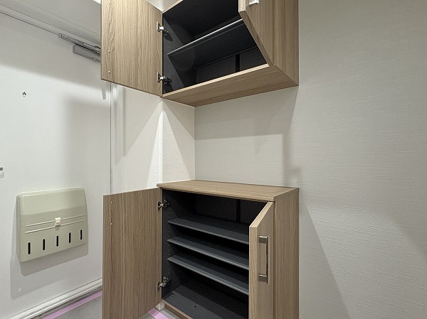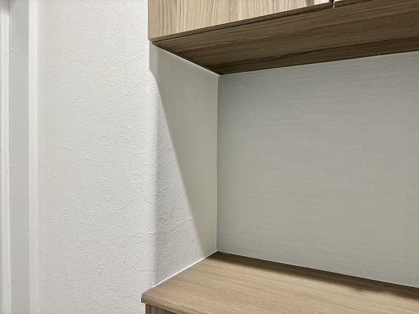 シューズボックスには上下に棚があり、その間にはちょっとしたスペースがあります。この部分だけ壁の角が削られていたり、ブロック調のクロスが貼られていたり、凝った造りになっているのが不思議でした。お花を生けてみるのも良いですね。