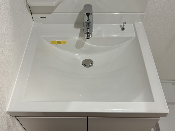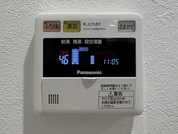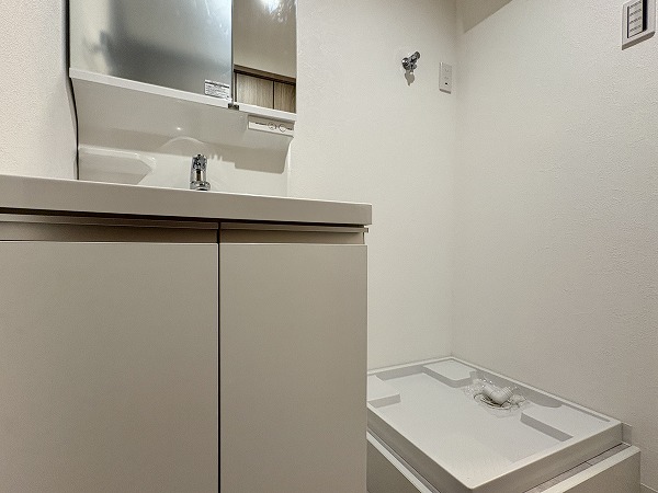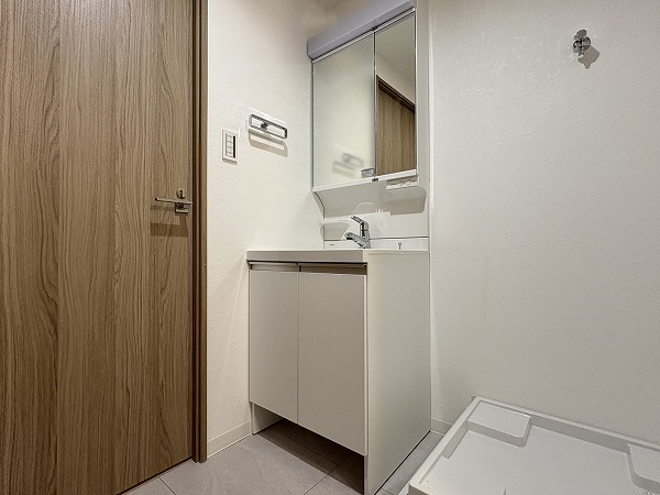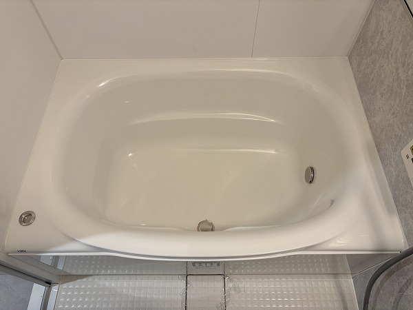 バスルームはグレーとホワイトが基調となったシンプルテイスト。石目調の壁は目に優しく、バスタイムをよりリラックスできる時間にしてくれます。また、水垢や汚れが目立ちにくいというメリットもあり、実用的です!