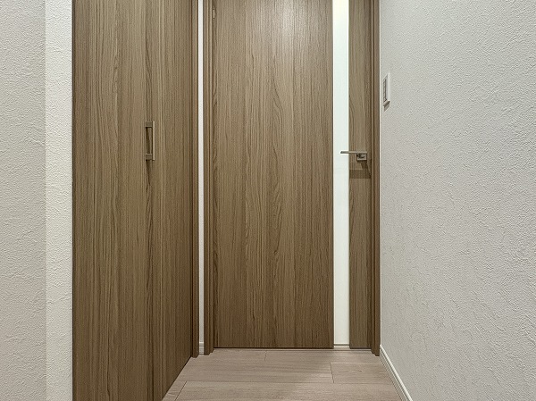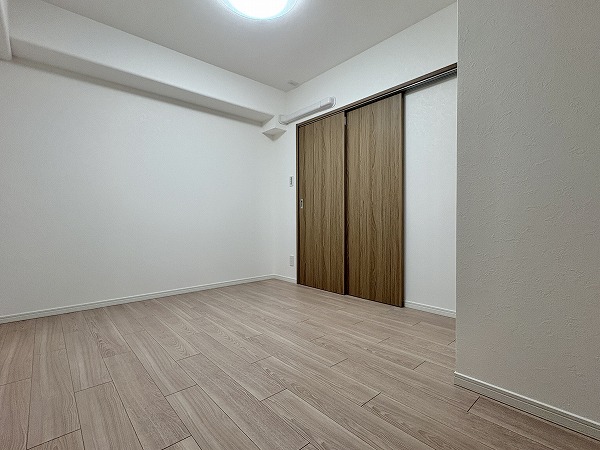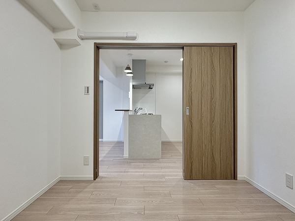 こちらはキッチン真横にある約5.2帖の洋室です。床の木目とは異なる、濃いブラウンの木目調の扉が、重厚感があります。寝室や作業部屋としてご利用するのがベターです◎窓はありませんが、リビングとつながる扉が引き戸なので、日中は引き戸を開けて外光を取り込みましょう☀