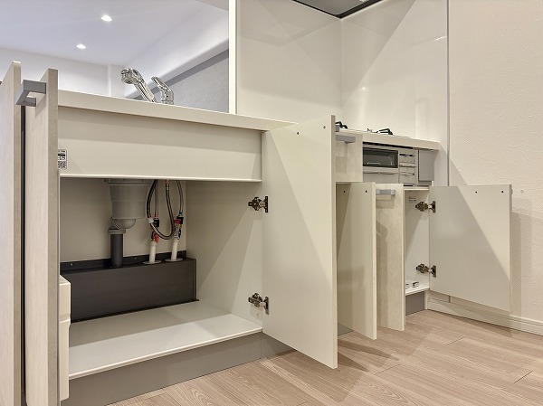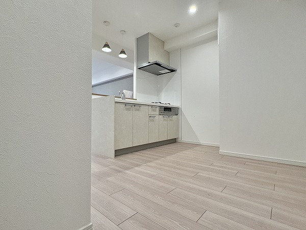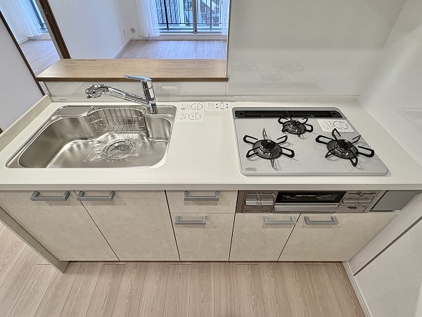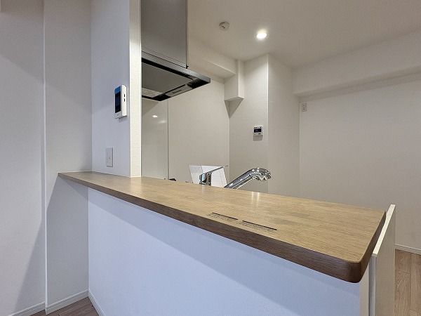 キッチンは広々としていて、リビングダイニングと向かい合った位置にあるペニンシュラキッチンです。こちらも東向きの窓からの採光で、日中は明るく快適に調理できます!食器やキッチン家電は背面のゆとりのあるスペースに配置しましょう◎