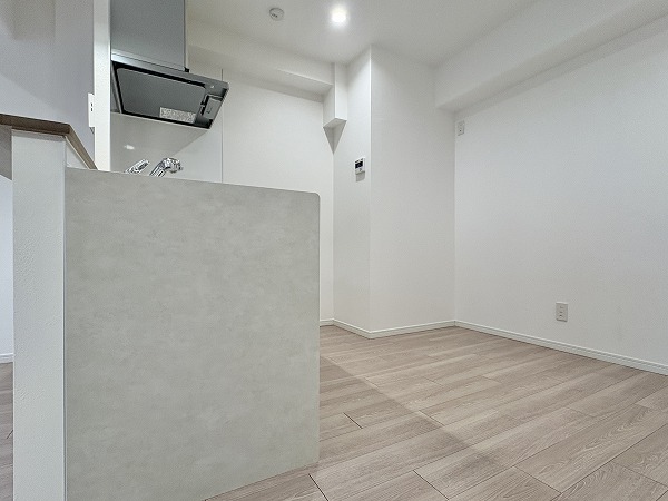 LDKは約13帖の広さです。モダンで落ち着いた配色のクロス・フローリングは、視覚的に丸く優しく、暮らしやすいのが魅力。東向きのバルコニーからの温かい光を受けて、朝からお昼にかけて室内は明るく快適です☀一家の団らん・愛犬愛猫との戯れ・のんびりとした休日はこちらで実現しましょう!