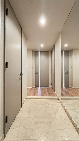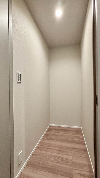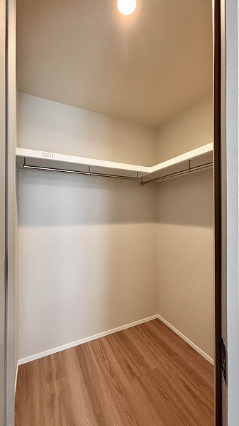 玄関左手には可動棚がL字に配されたシューズインクローゼットがあり、靴やバッグ、小物を美しく整理可能。出かける前の身支度もスムーズに行え、帰宅時も玄関が散らからず清々しい空間をキープできますね。お客様を迎える際も清潔感のある印象に♥