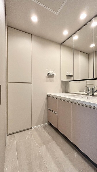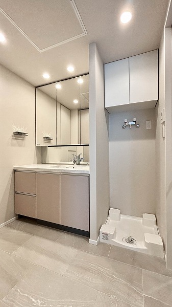 洗面化粧台、洗濯機置き場、バスルームがすっきりとまとまったパウダールームは、日々の家事や身支度を快適にサポート。効率的な動線で朝のバタバタした時間もスムーズに。限られたスペースながら使い勝手が良く、清潔感のある空間が保てます✧