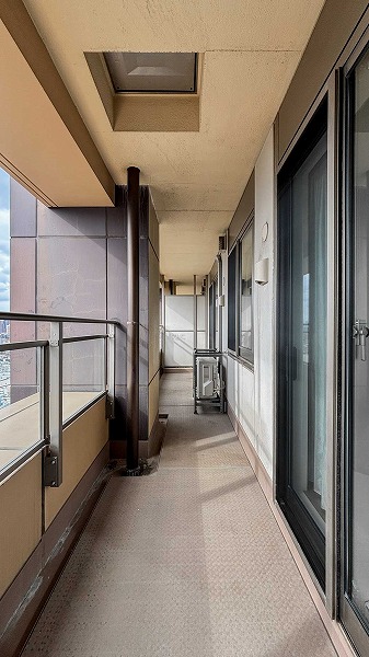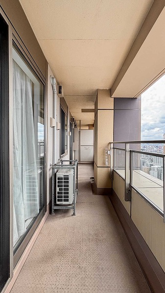 高層階ならではの特権、28階バルコニーからの眺めは空が間近に広がる開放感たっぷりの景色。約12.23㎡の広々としたバルコニーは、ガーデンファニチャーを置いてアウトドアリビングとしてお外時間を楽しむ場所として活躍します。