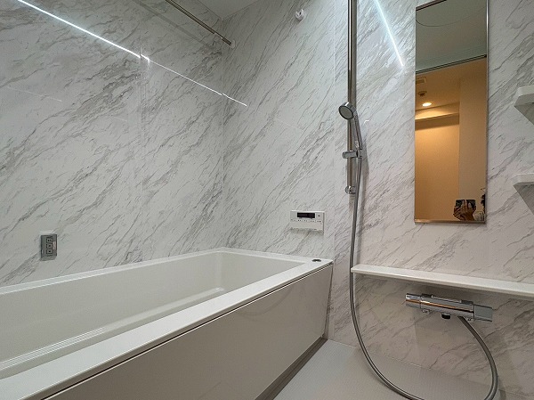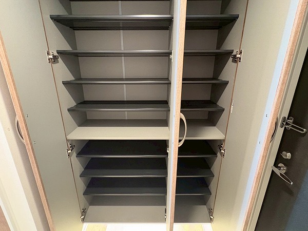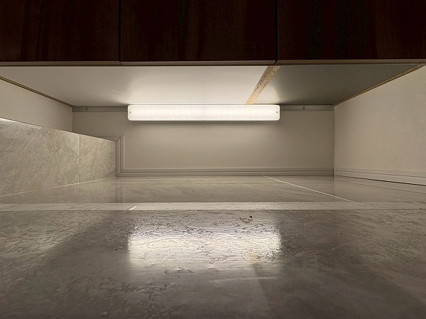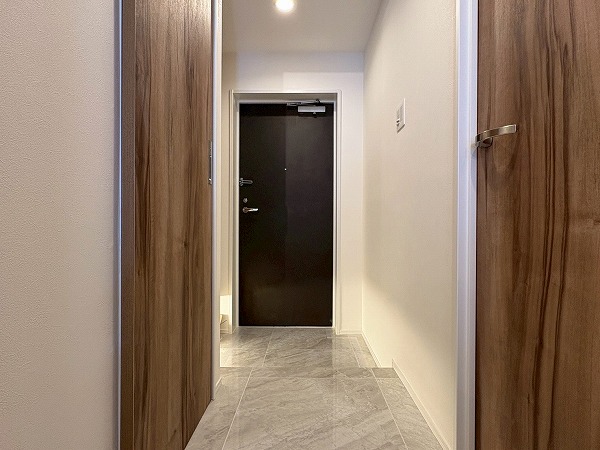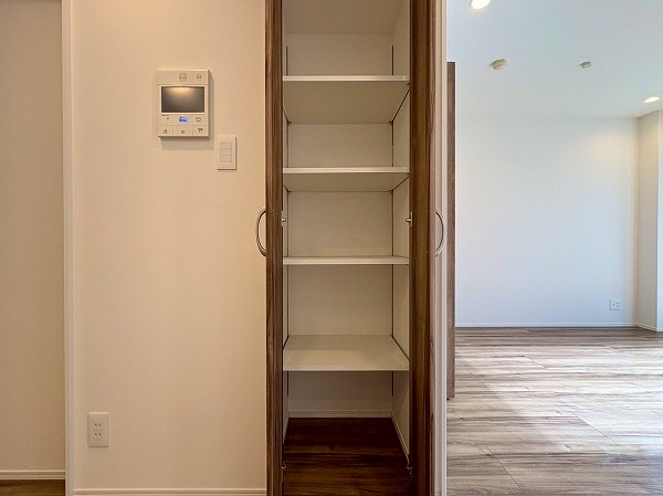玄関には大容量のシューズボックスと、床を照らす間接照明があります。白を基調とした奥行きがあり高級感あふれる空間です。白い床は汚れやほこりなどに気づきやすく、こまめに掃除することで常に清潔案を保つことができます◎