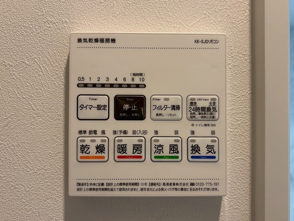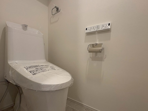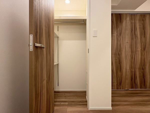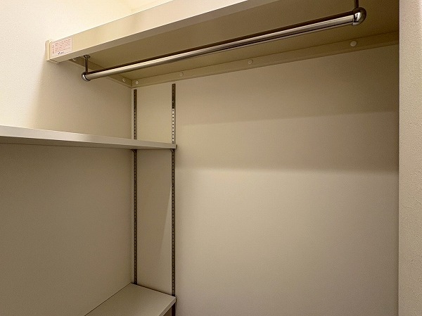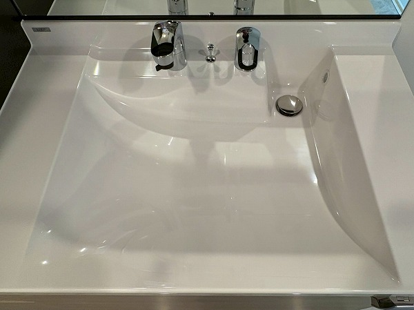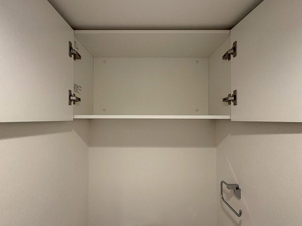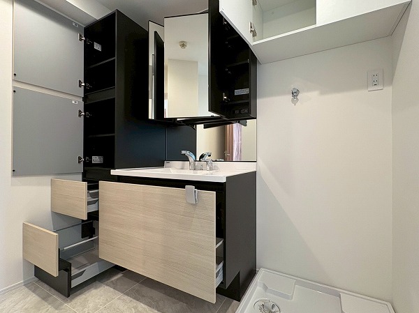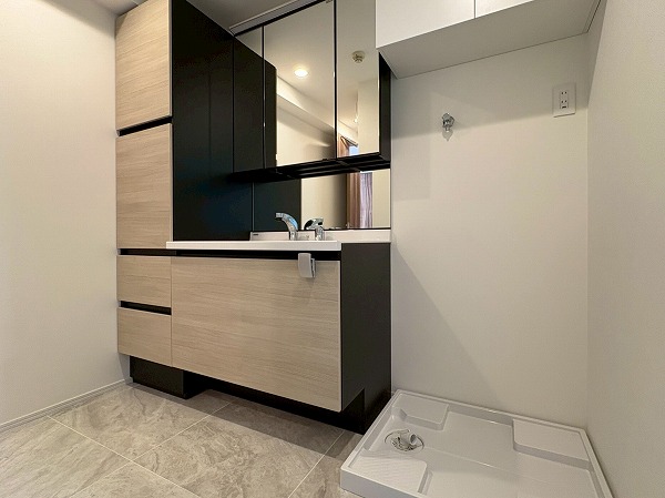 こちらがパウダールームです。玄関と同様に色を基調としたお部屋で、清潔感がありますね。収納は洗濯機上部と洗面台洗面台に。洗面台の収納は大小含め9つもあり、水場周りの大物・小物はすべてしまうことができるでしょう!