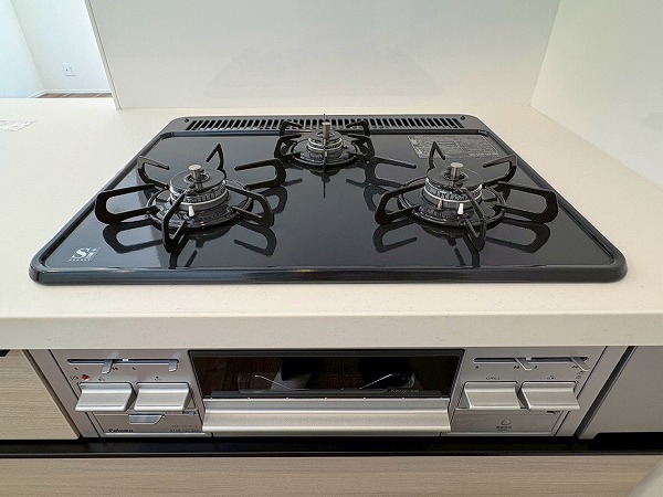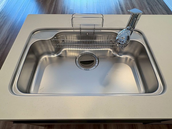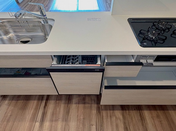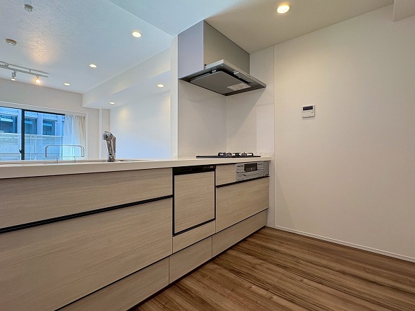 キッチンはペニンシュラ型で、その後ろには大きなスペース!冷蔵庫やレンジなどのキッチン家電から食器棚まで、余裕を持って置けます!キッチンからリビング・ダイニングを見渡すことができるので、お料理しながら家族の時間も十分に過ごしていただけます◎