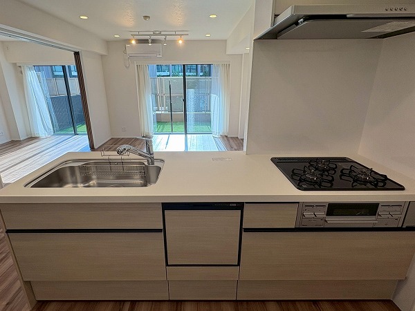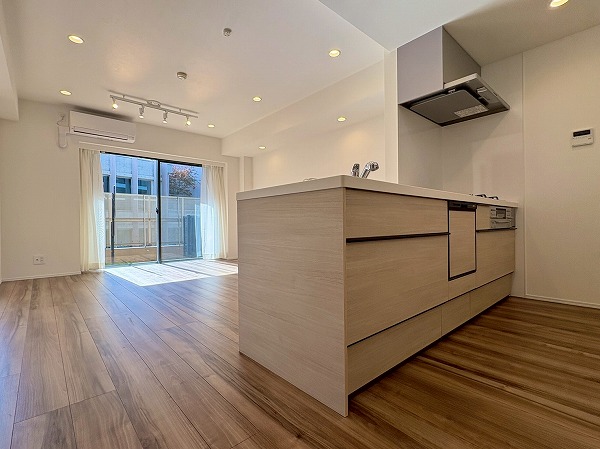今回ご紹介するのは、専有面積66.75㎡の、広いお庭が付いた3LDKのオシャレなお部屋です!扉とフローリングはダークブラウンのウッド調で統一されており、キッチンの側面はよく見ると薄いブラウンのウッド調になっております。シンプルながらに細かな遊び心を感じます。