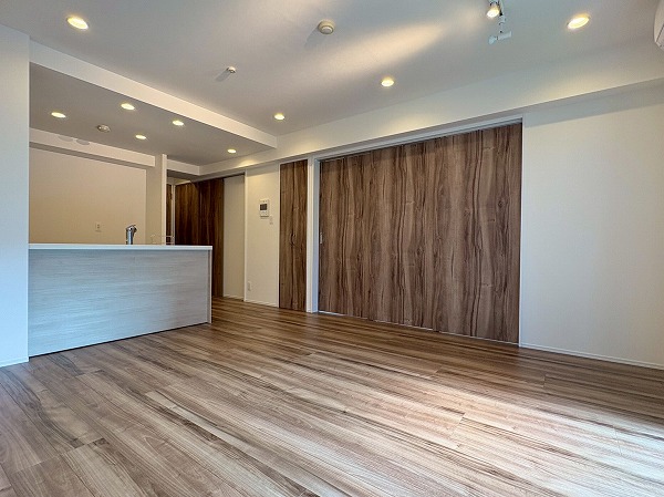 約14.3帖のLDKは長細い造りではなく、スクエアに近い、より広々とした印象のお部屋!自由度が高いため、家具の配置はとにかく悩みそうです...!奥に見えるお庭への導線を残しつつ、横のベッドルームへの導線も残しつつ...など、想像が膨らみます!