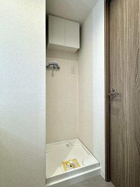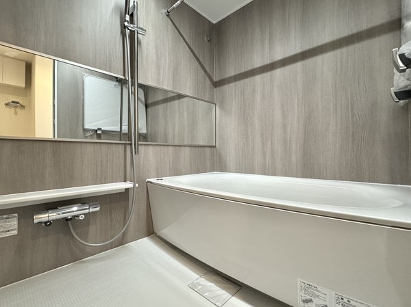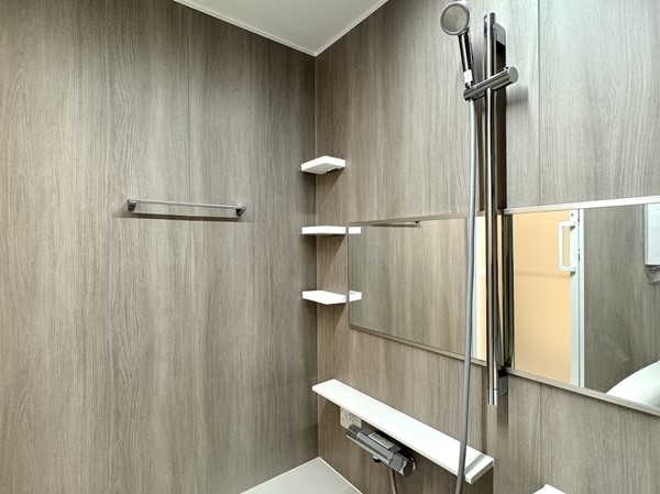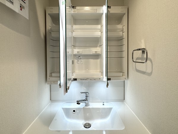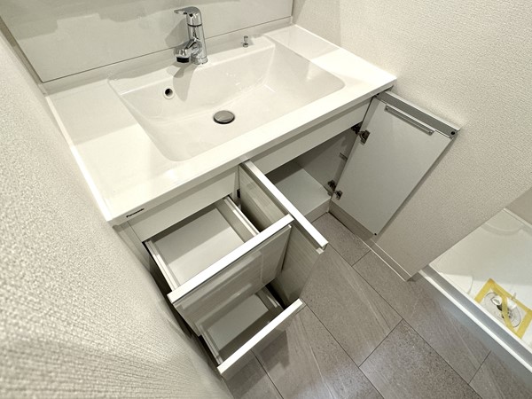 バスルーム・洗濯機置き場・洗面化粧台をひとまとめにしたサニタリールームは、動線がコンパクトで使いやすい設計。清潔感のあるデザインで、毎日使う場所だからこそ心地よさが感じられました。洗面化粧台にはミラーキャビネットをはじめとした収納スペースを確保しており、歯ブラシなどの細かなアイテムから、洗剤や日用品のストックまでまとめて収納可能。