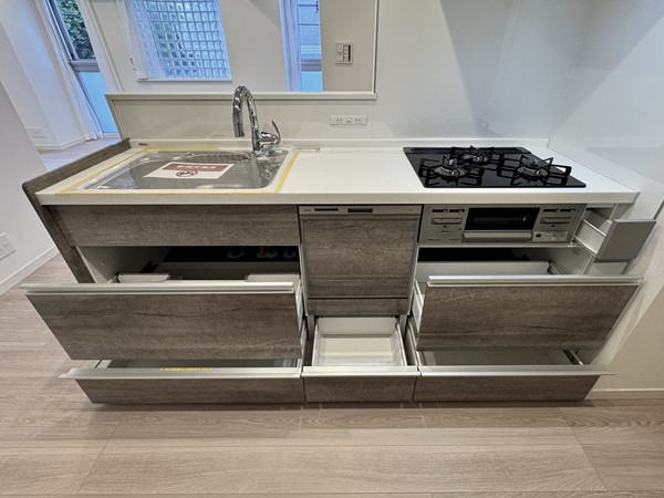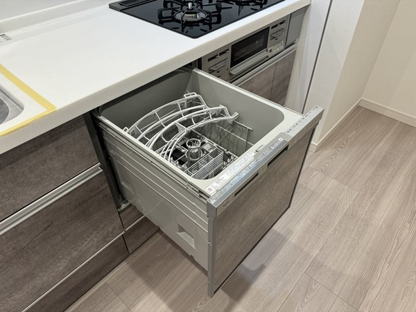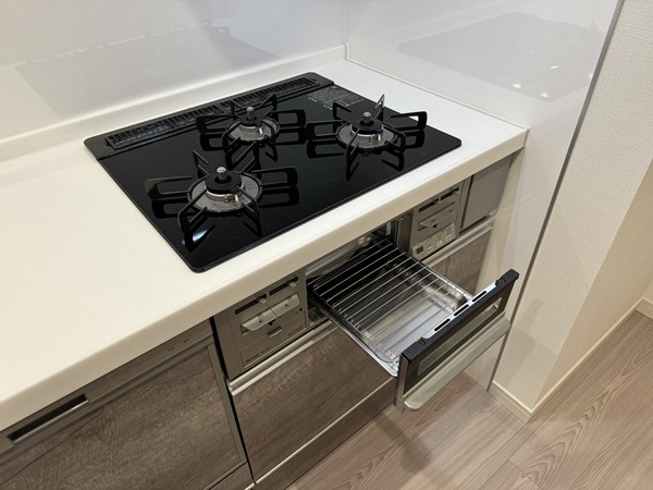 木目の風合いが優しい印象を与えるキッチンは、見た目と使い勝手を両立。3口コンロ+グリル付きで、家族分の料理も効率よくこなせます。食洗機が備わっているため、食後の時間をゆったり過ごせるのも嬉しいですね。
