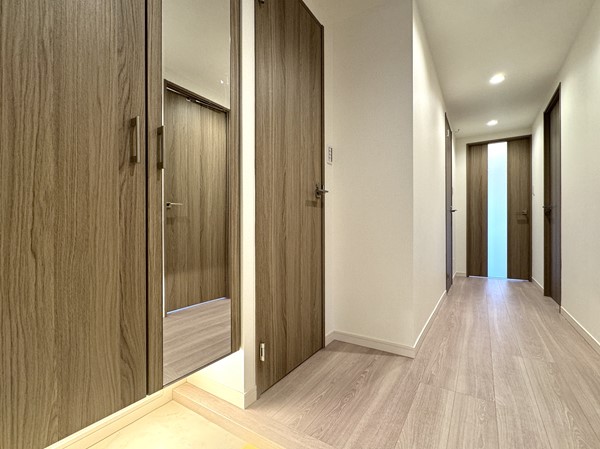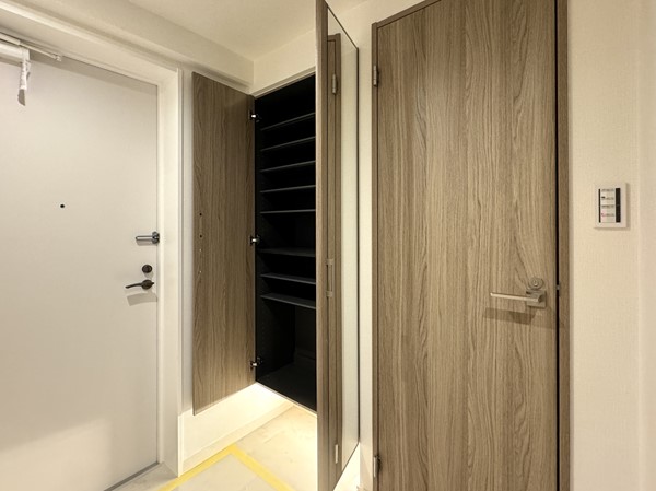 玄関にはトールタイプのシューズボックスを設置し、ご家族全員分の靴をまとめてすっきり収納◎扉には全身ミラーが付いており、お出かけ前の身だしなみチェックもスムーズです。足元をやさしく照らすフットライト付きで、夜間の帰宅時も安心。