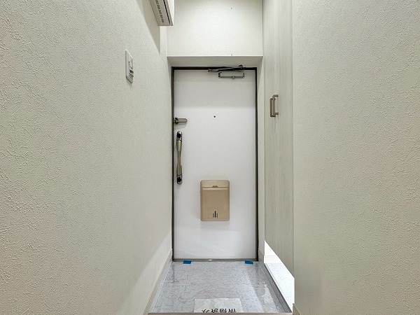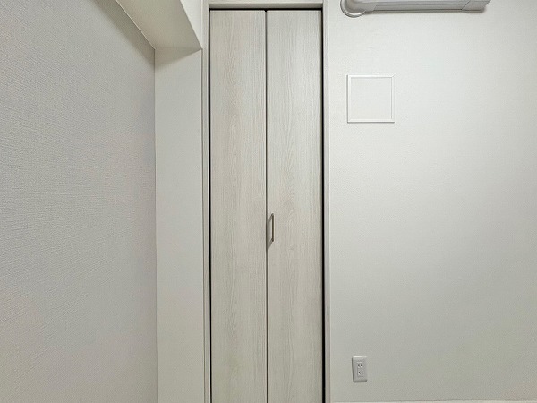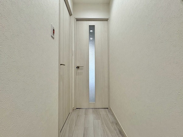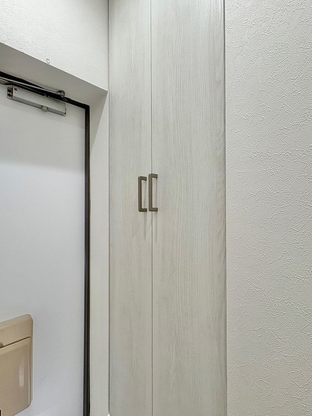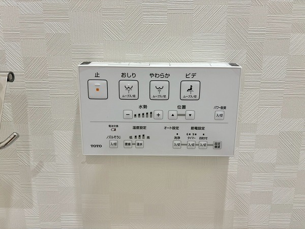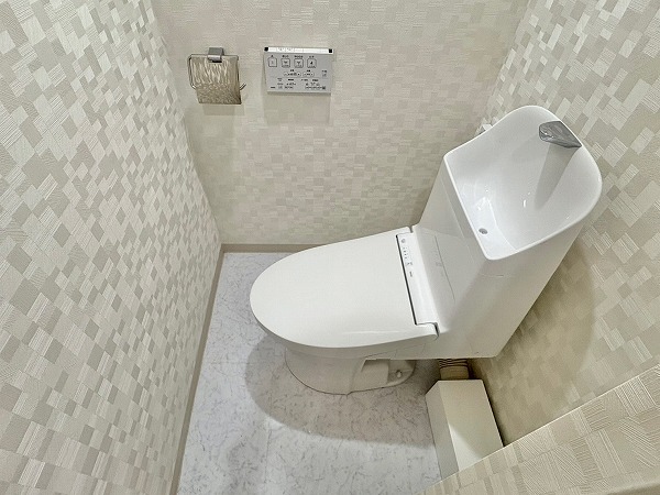デザイン性のあるクロスで仕上げられたトイレは、シンプルながら上質な雰囲気。手洗い一体型で節水にも配慮されており、限られた空間でも快適にご使用いただけます。温水洗浄とウォシュレット機能も備わり、日常の使い勝手も抜群です。
