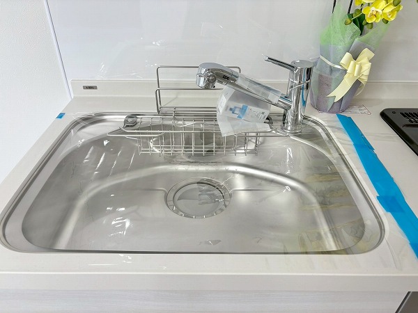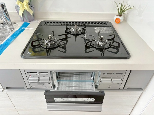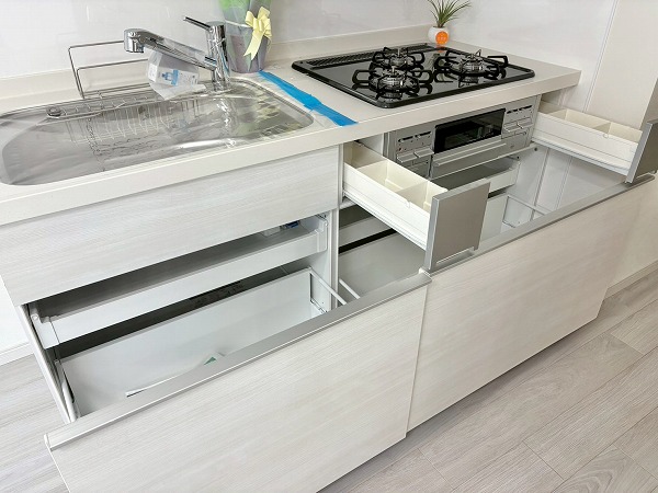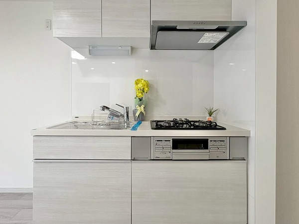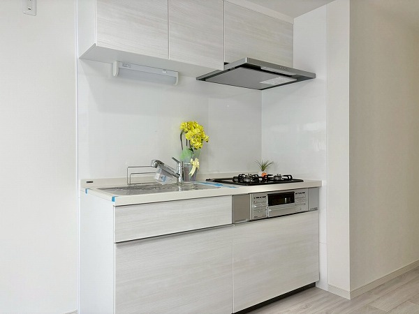 壁付けタイプのキッチンは、空間にすっきりと溶け込む洗練されたデザイン✧ コンパクトながら機能性に優れ、リビングダイニングの開放感をしっかりとキープしています。シンク・コンロ・作業スペースが一直線に配置されているため、調理から片付けまでの動線がスムーズ♩